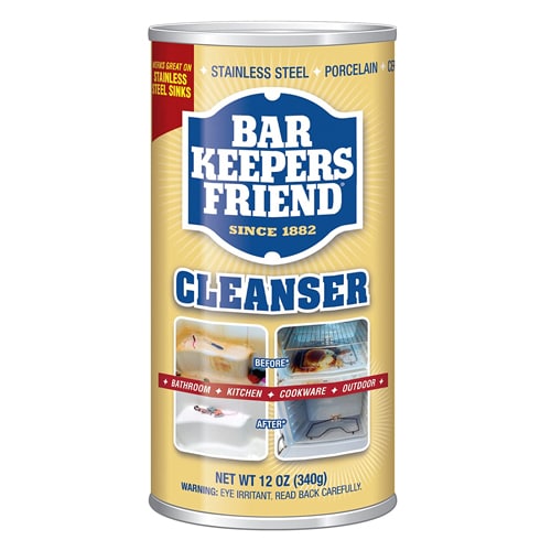 click here to buyEvery household should have Barkeeper’s Friend. It is your friend! Use on dirty pots, hard water stains, kitchen sink and to clean your bathtub properly.