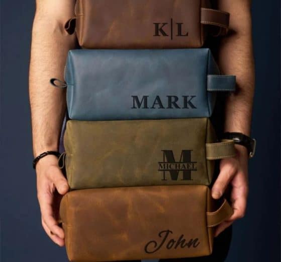 Impress your groomsmen with a stylish personalized men’s leather toiletry bag, perfect for travel