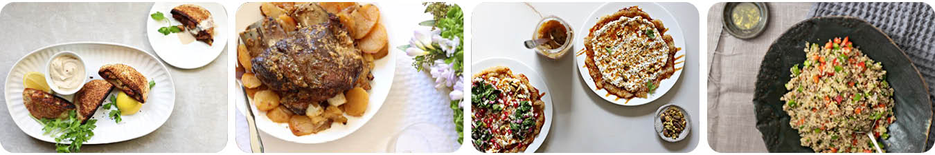 Fresh Pita * Za’atar Roasted Cauliflower Salad * Sina’s Shuk Salad (Best of Kosher) OR Tabbouleh-Inspired Quinoa Salad * Eggplant Carpaccio * Chummus/Tehina Platter * Lehme B’agine * Lamb Arayes (swap salmon for ground meat or lamb) * Rice MAIN: Flanken Roast