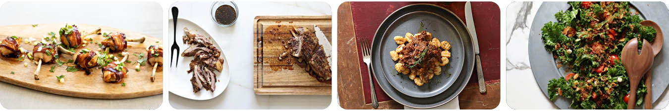 FISH COURSE: Salmon Crudo APPETIZERS, SALADS, SIDES: Short Rib Gnocchi * Lamb Riblets * Facon Wrapped Chicken Drumsticks * Corn Riblets * Panko-Topped Kale Salad * Sesame Cucumbers * Garlic Confit Rice OR Wild Mushroom Rice MAIN: Beer-Braised Short Ribs