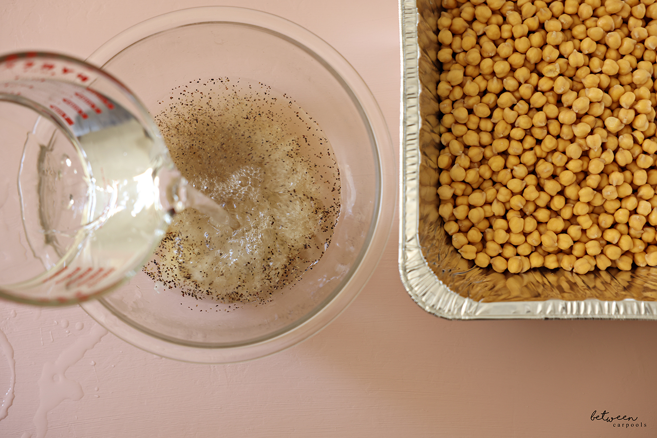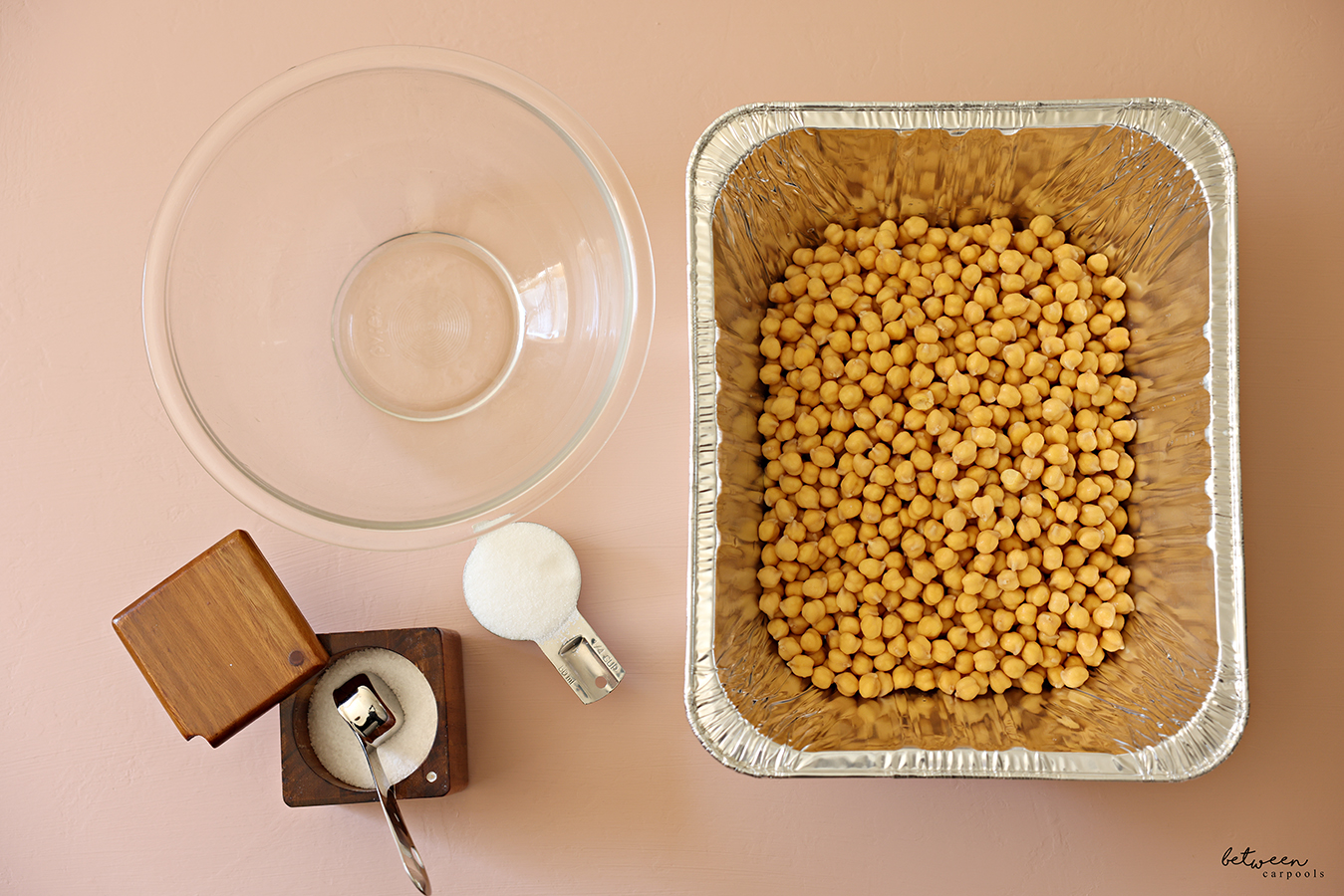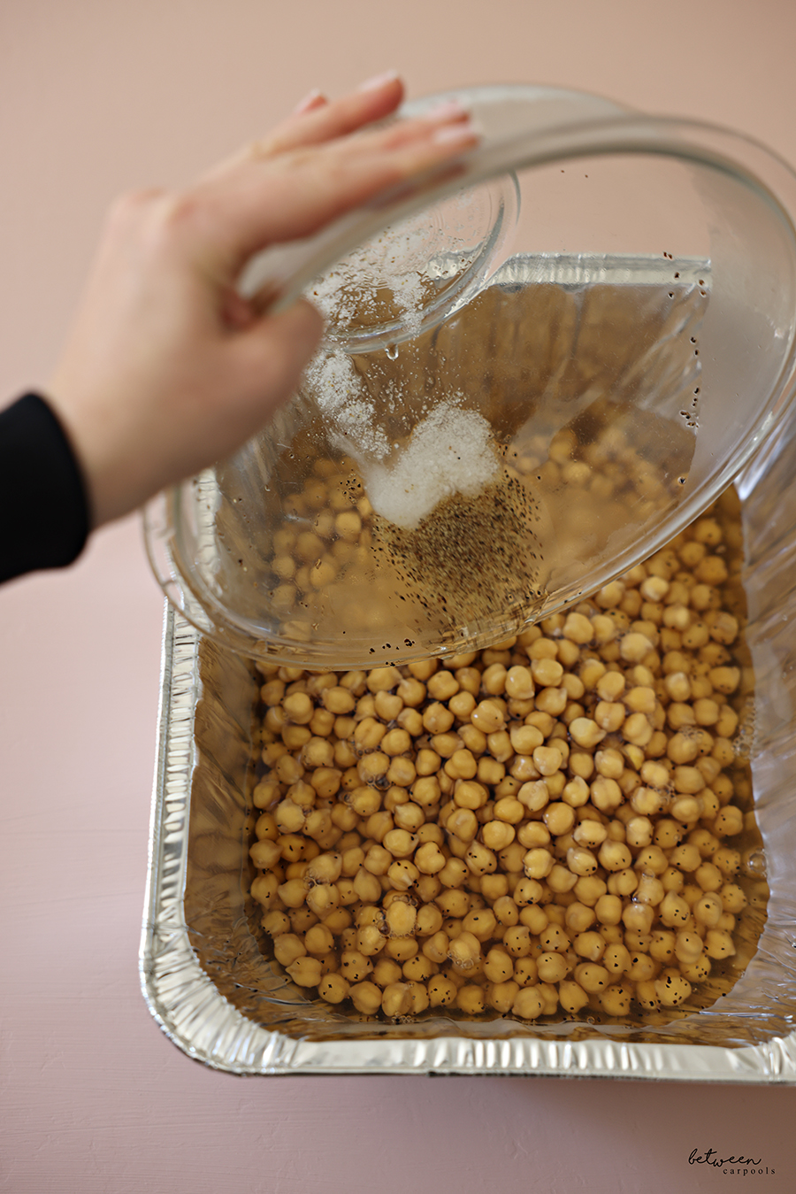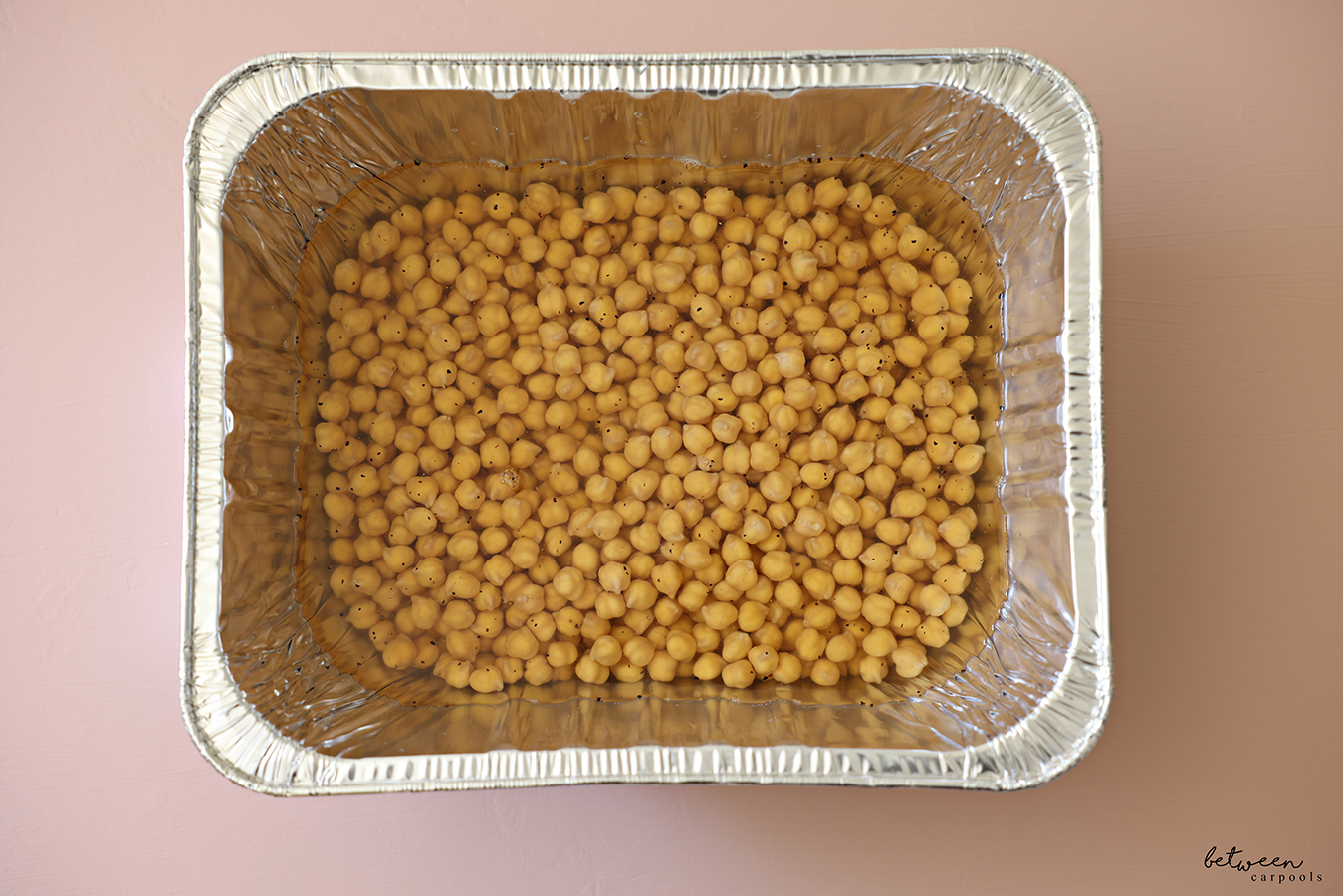 Place the rinsed chickpeas in a 9×13 (we used a deep 9×13 for the photos, but really, it’s not necessary. You might want to place the regular 9×13 on a sheet pan to catch any eventual spills.)