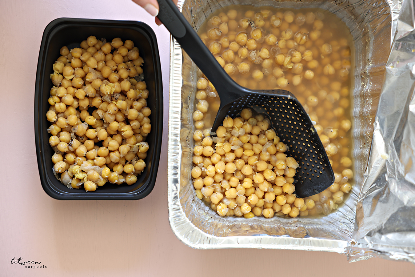 Drain the chickpeas or remove them from the pan using a slotted spoon or our favorite Colander Spoon. We like to do it this way so as not to ruin the chickpeas.