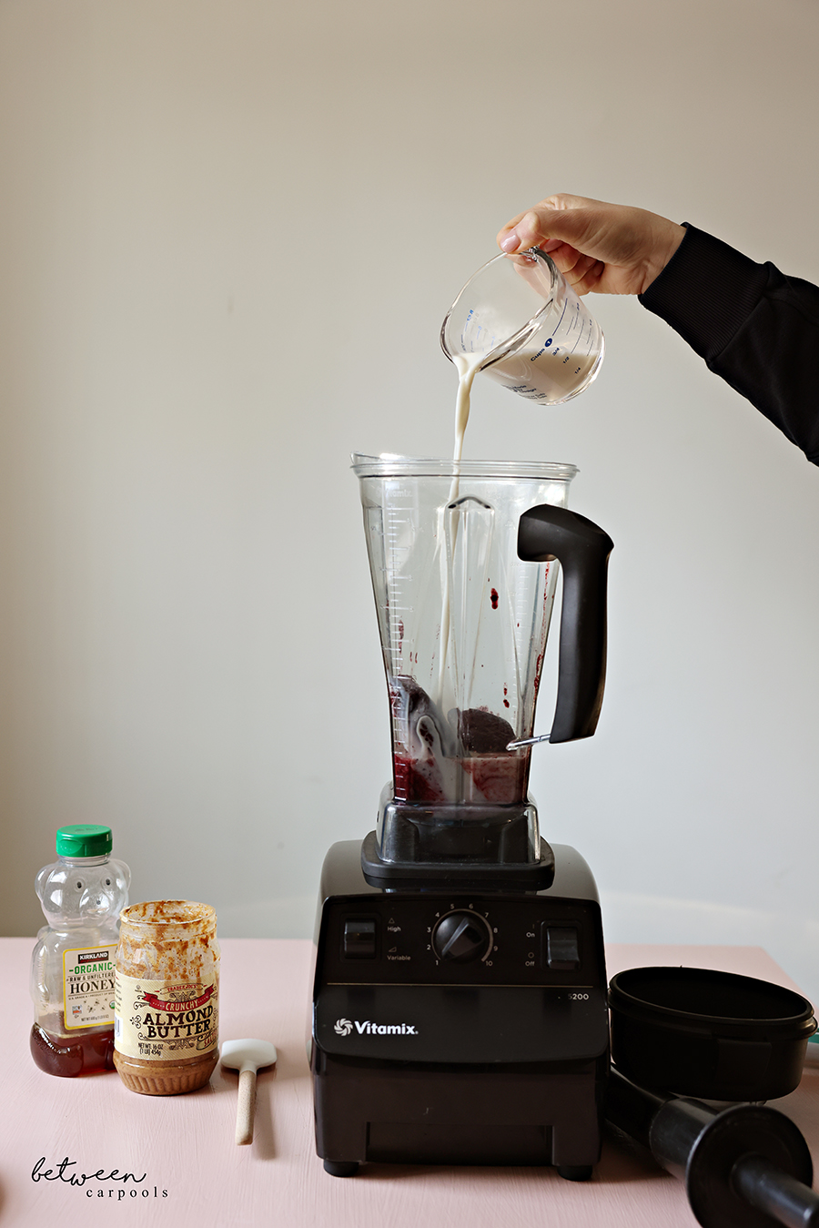 If using a blender like the Vitamix, place the almond milk first. The liquids help get things moving.