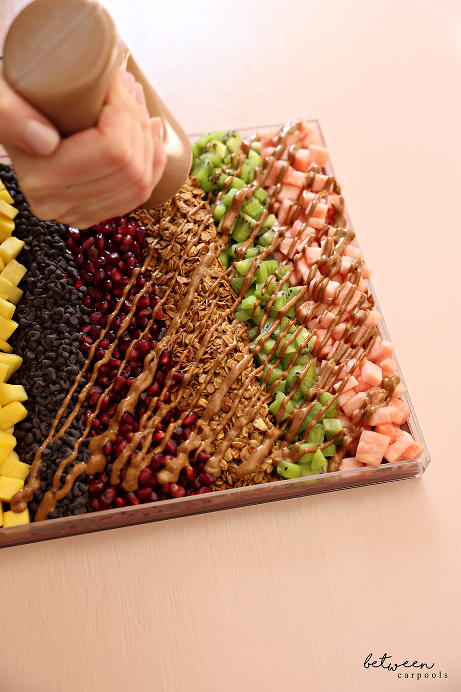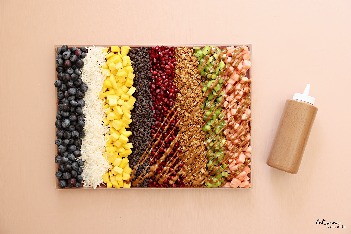 So, if you are looking to bring something special to your host this Purim, or looking to prep and freeze a dessert in advance, here is a recipe we love–and all the steps involved in making that perfect açaí board.