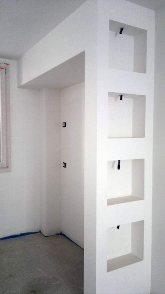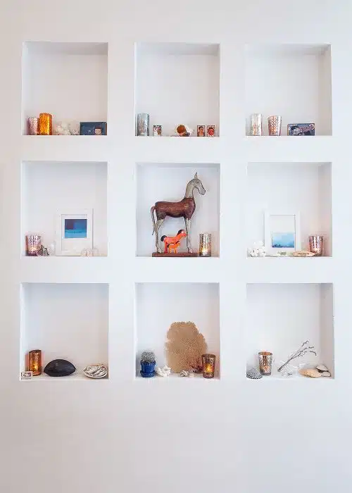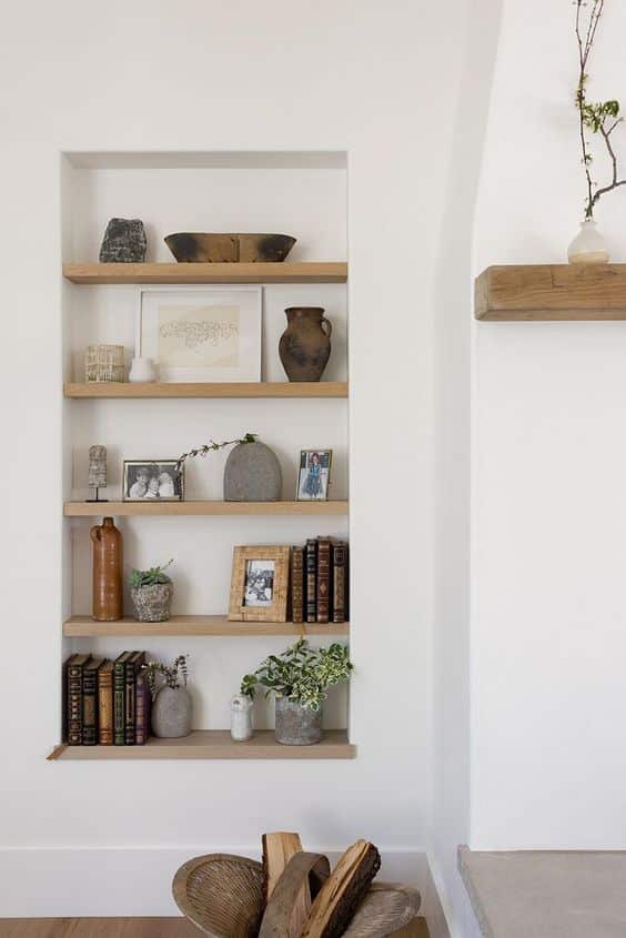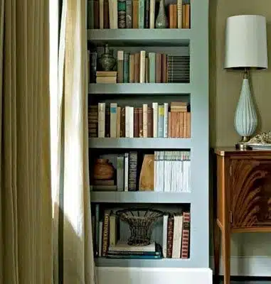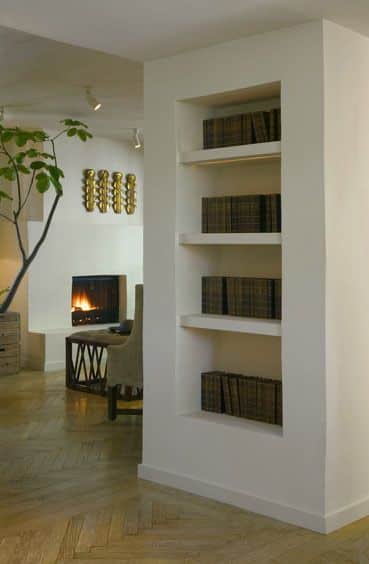 When I moved into my house about 13 years ago, there were two niches where I thought, “Custom bookcases will be perfect over there.” Somehow, all this time passed, and so many more important things came up. Those two niches sat empty waiting for their expensive woodwork. Then, I saw this concept and fell in love with the idea: building bookcases in the drywall.
