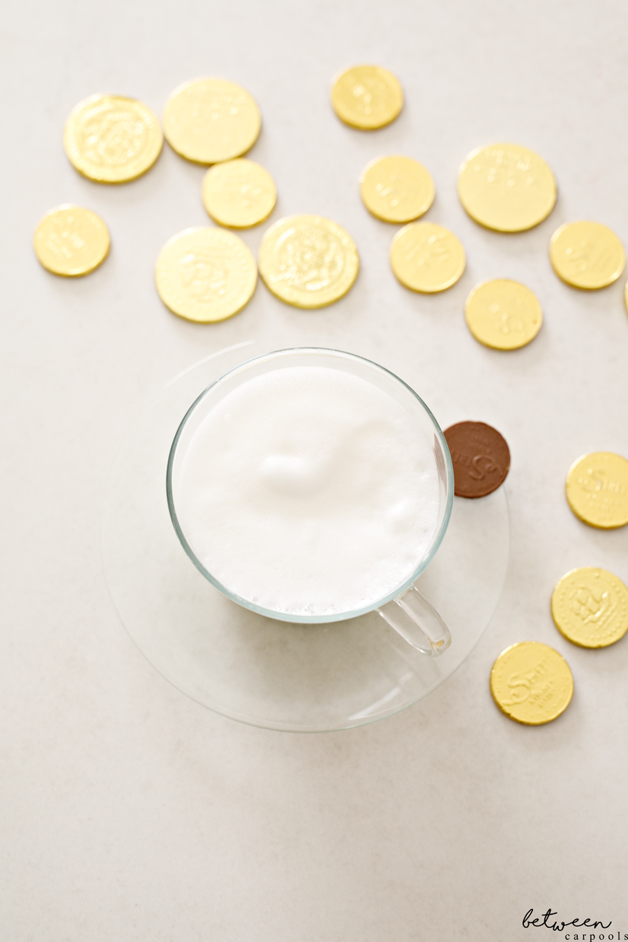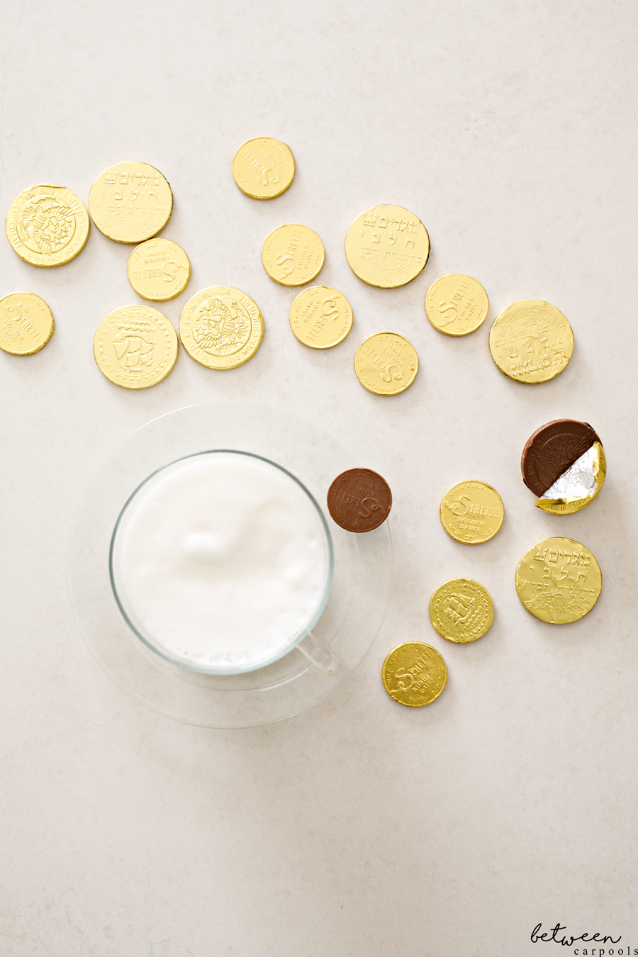 Pour some hot frothed milk over the coins and stir. That’s all. Let the kids mix and drink. Happy Chanukah!