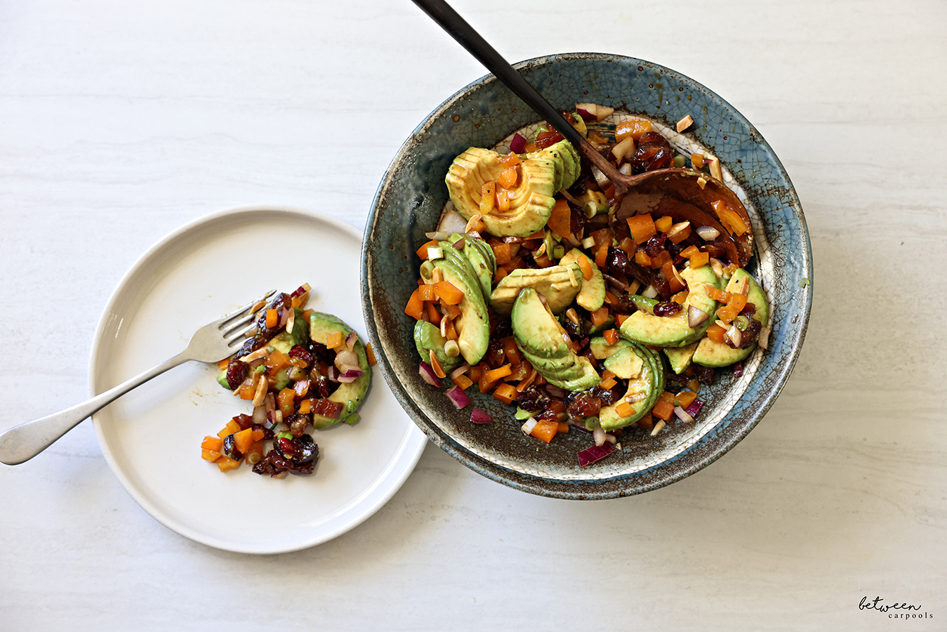 What I like about this avocado salad is all the variety. Usually, avocado salads are one-note. Yes, we love avocado but adding some crunchy and chewy factors to the usual mush can’t be bad.
