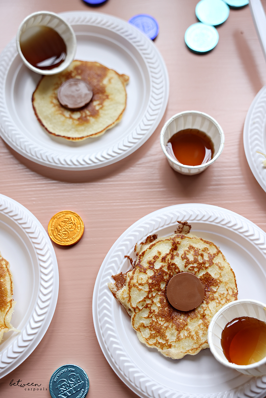 If you have gelt available (dairy, preferably!), add them to your pancakes in the morning. Whether you make them from scratch using our favorite Basic Pancakes from Dinner Done, or you use frozen pancake batter, no matter.