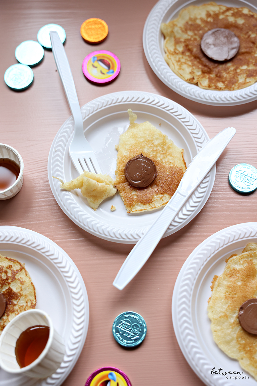 If you have gelt available (dairy, preferably!), add them to your pancakes in the morning. Whether you make them from scratch using our favorite Basic Pancakes from Dinner Done, or you use frozen pancake batter, no matter.