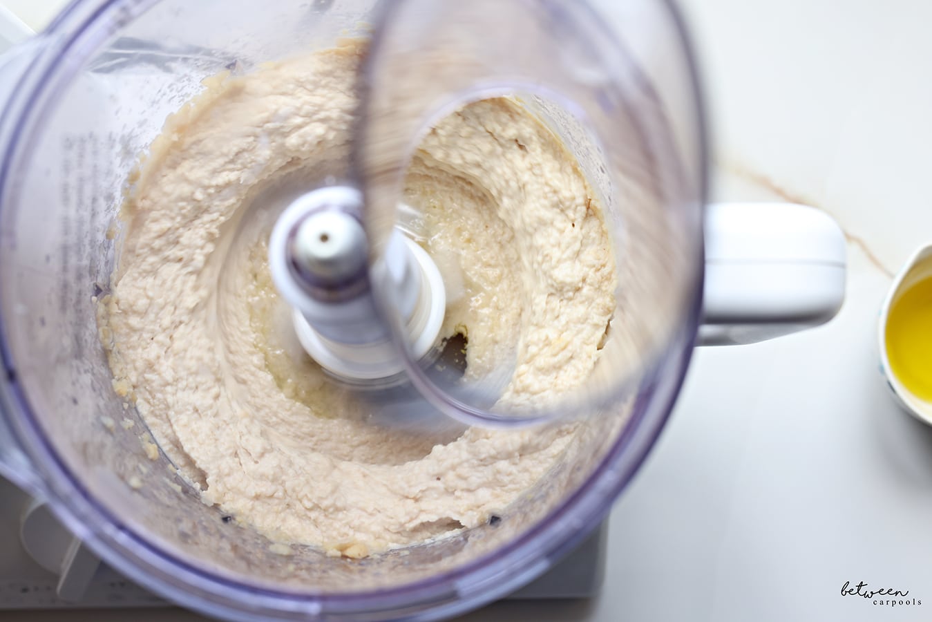 Add the lemon juice, tahini and water, blending well until smooth. Drizzle in olive oil towards the end.