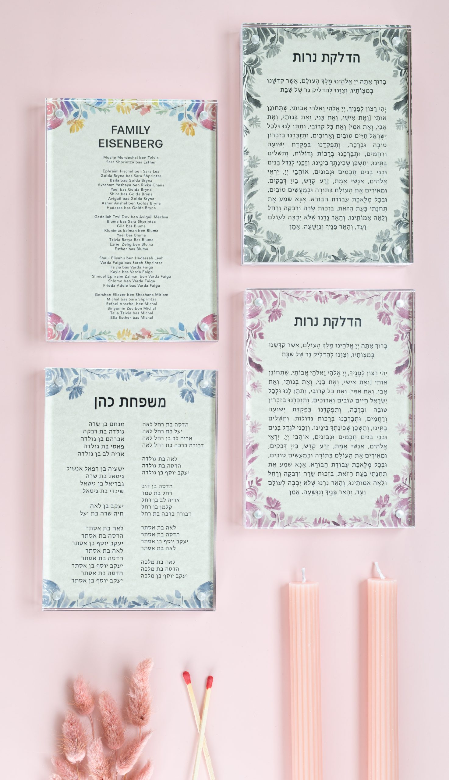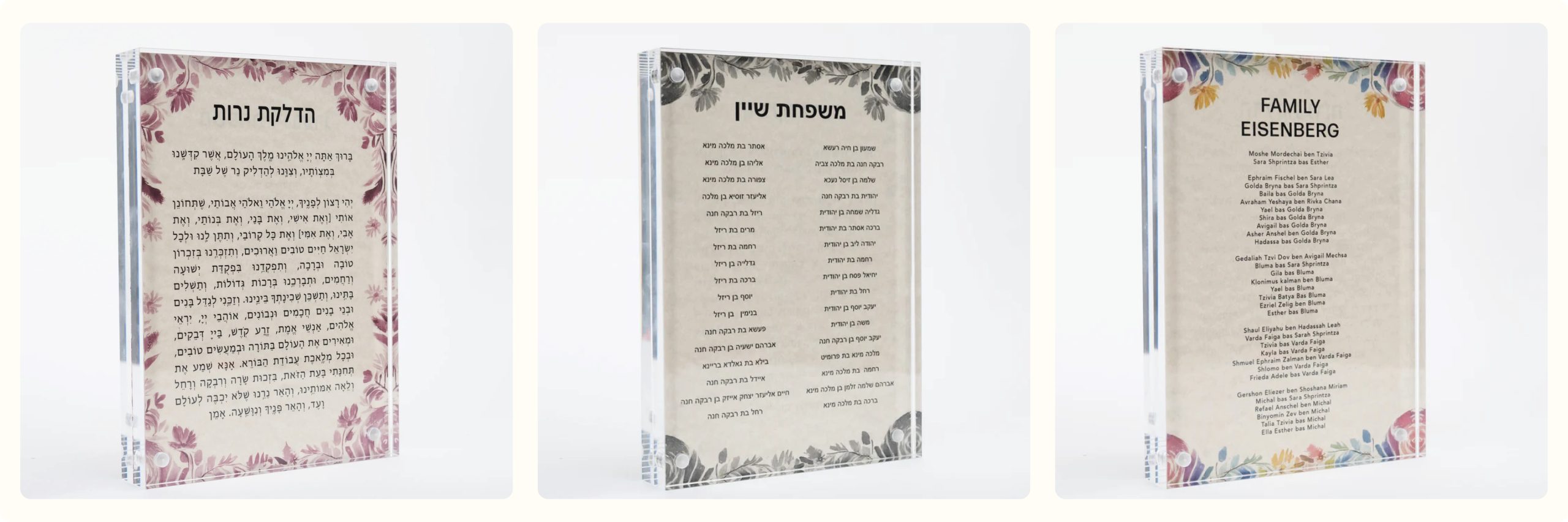 Available in 4 colors and 2 sizes, YS Judaica works with you to compile the list of names if needed. Hebrew or English, for families big or small. They’ll design your frame to look just right for you, and send a draft to approve before print, ensuring it is exactly how you want it. Each plaque comes with a matching gift note, and orders can be placed easily over WhatsApp.