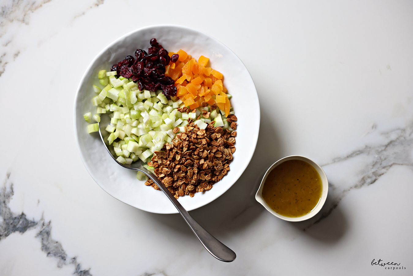 Then, add your dried fruits like apricots and Craisins. Want to add some dates for this season? Go ahead. They’ll go perfectly. Really, you can use the dried fruits you already have on hand–you just want that chewy factor.