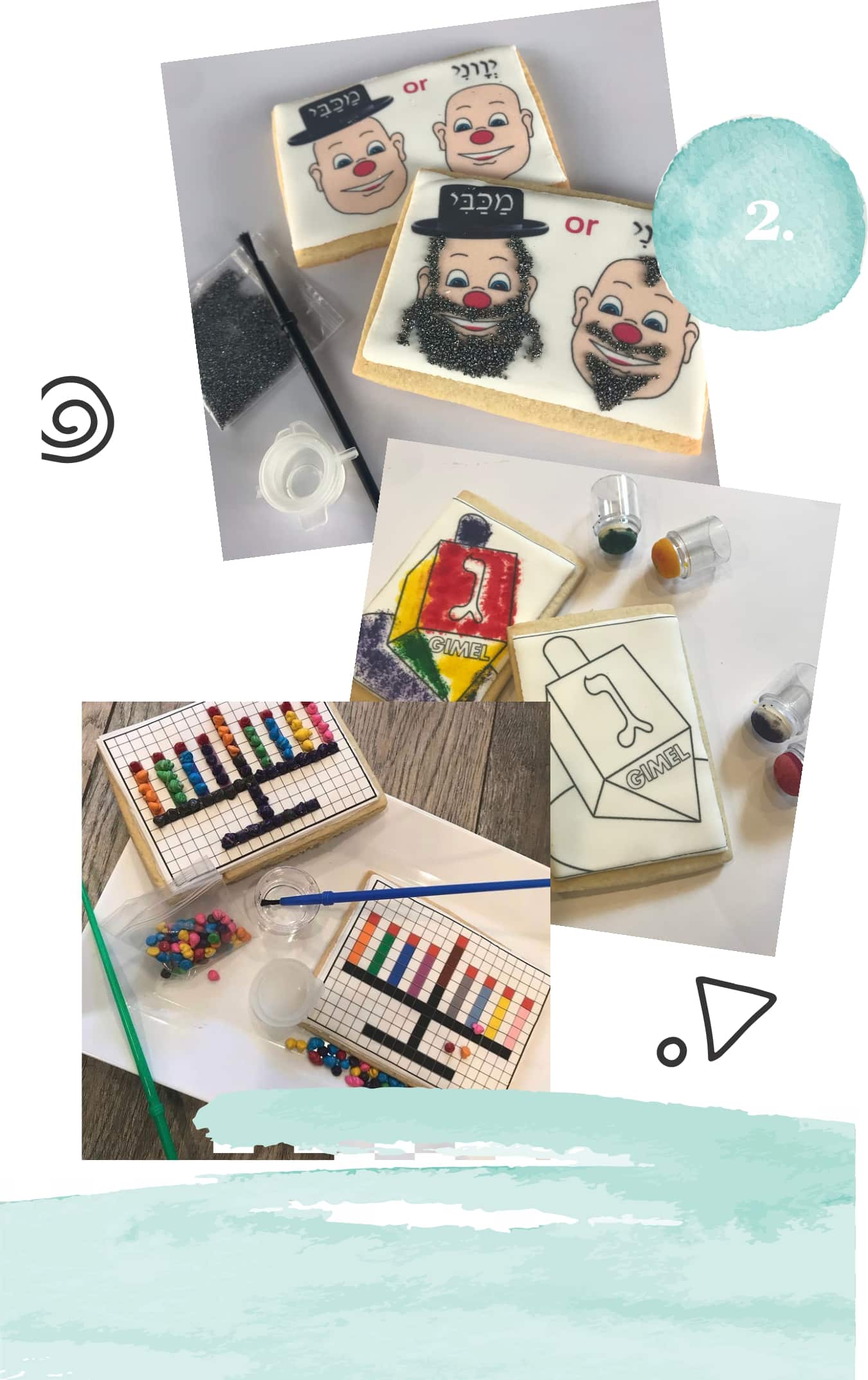 So cute! Besides looking adorable in their cute little pouches at your table, they are the perfect activity for your Chanukah party. They’ll keep the kiddies busy and giggling while they decorate – and eat – their cookies. Choose from the Mosaic Menorah Kit, Maccabi/Yavani Kit ($12 each), or the more budget-friendly family-pack Dot Art Cookies (6 cookies for $40 with paint and applicators). To order Text/WhatsApp: 347-831-9255, email frostedclass@gmail.com or contact via Instagram @frostedclass.