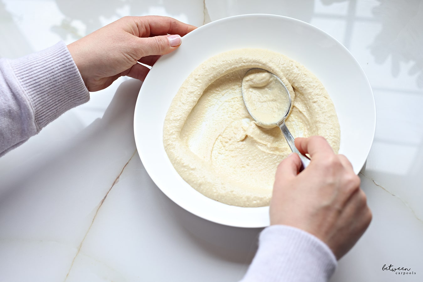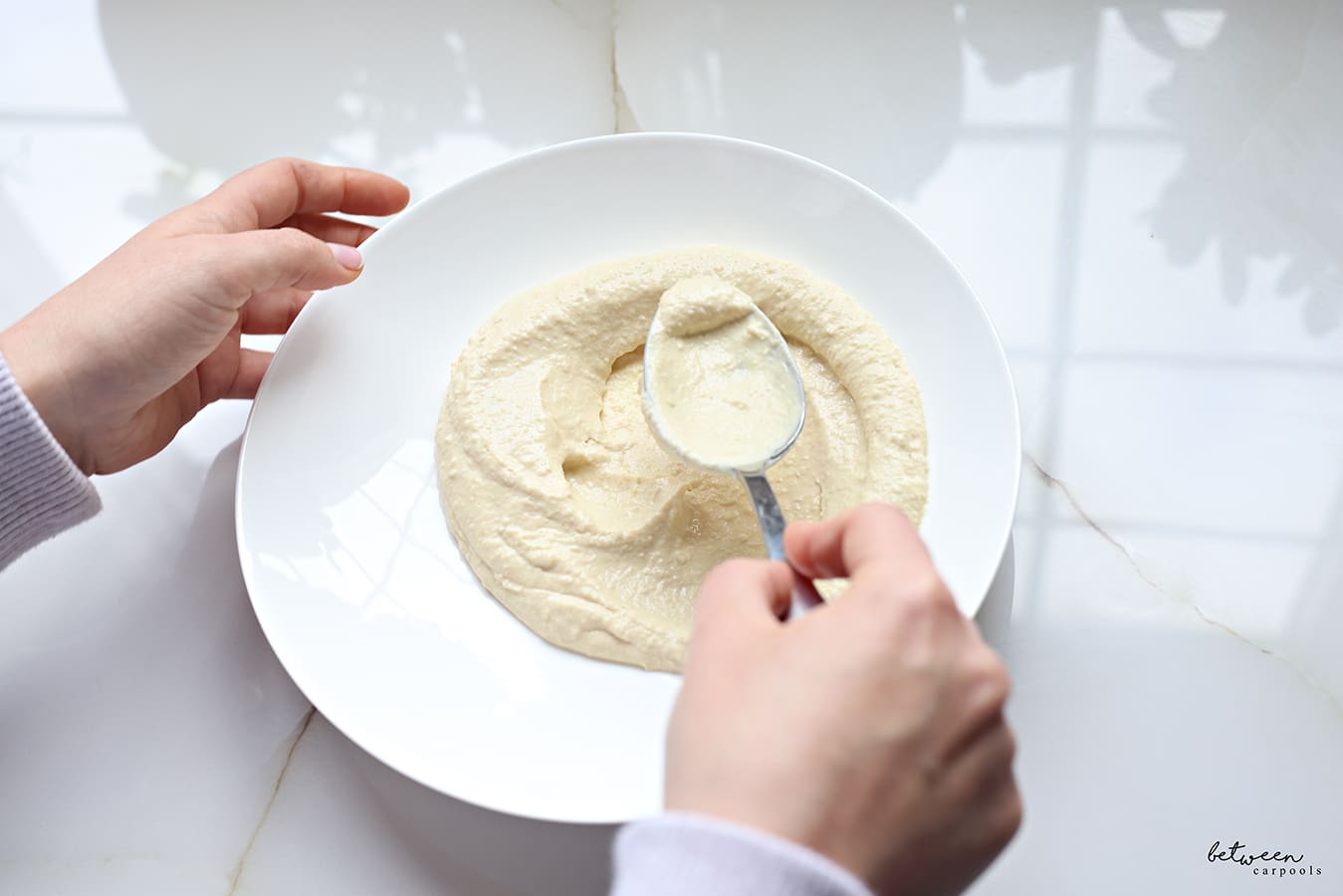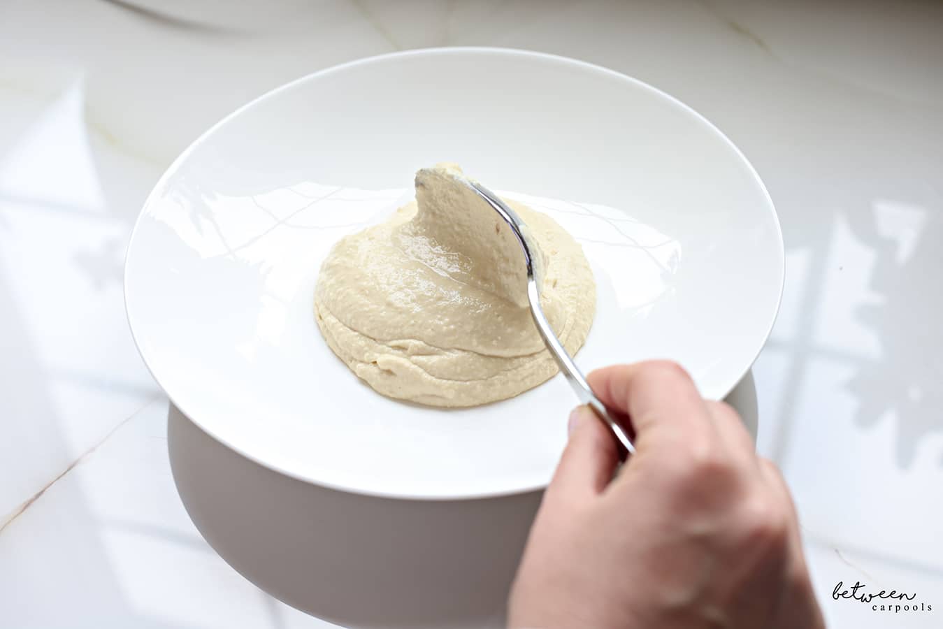 Then, using the back of a spoon, twirl the plate so that you spread the chummus