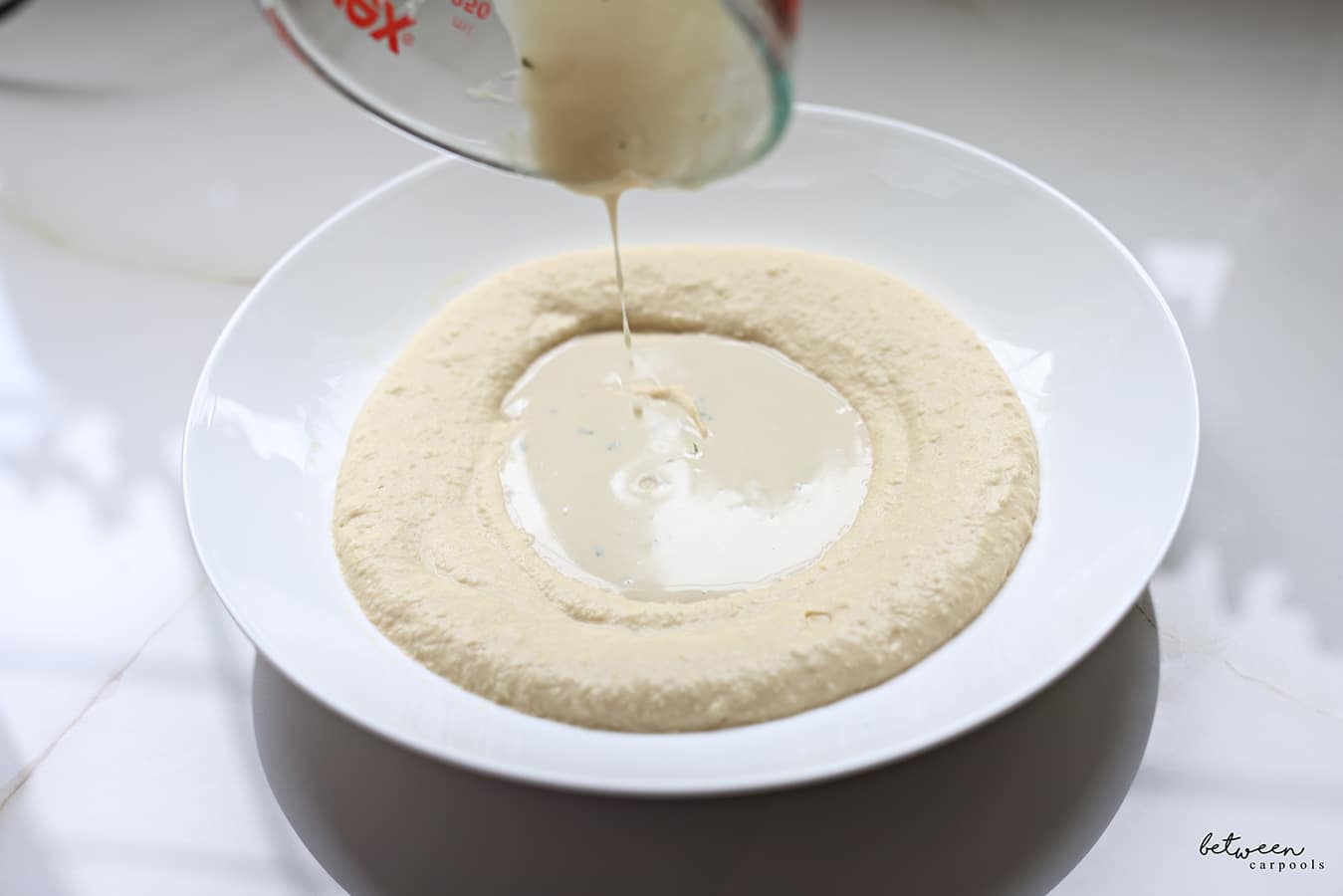 First, for the simple way: To plate your hummus, Drop a hefty spoonful of chummus onto a plate or very shallow bowl.