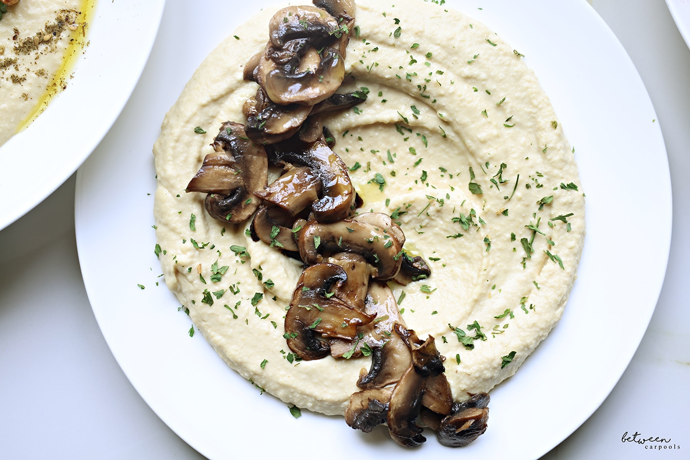 For the Roasted Mushrooms Plate: Sauté sliced mushrooms in a pan with some oil and a drop of chicken consommé powder. If you don’t want to use consommé powder, you can season lightly with some spices. Top chummus with warm mushrooms.