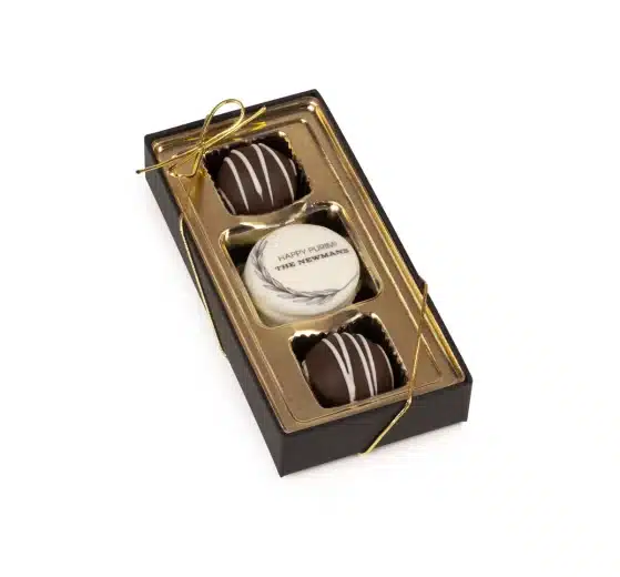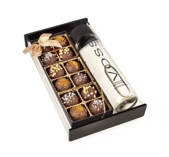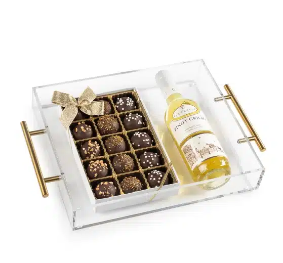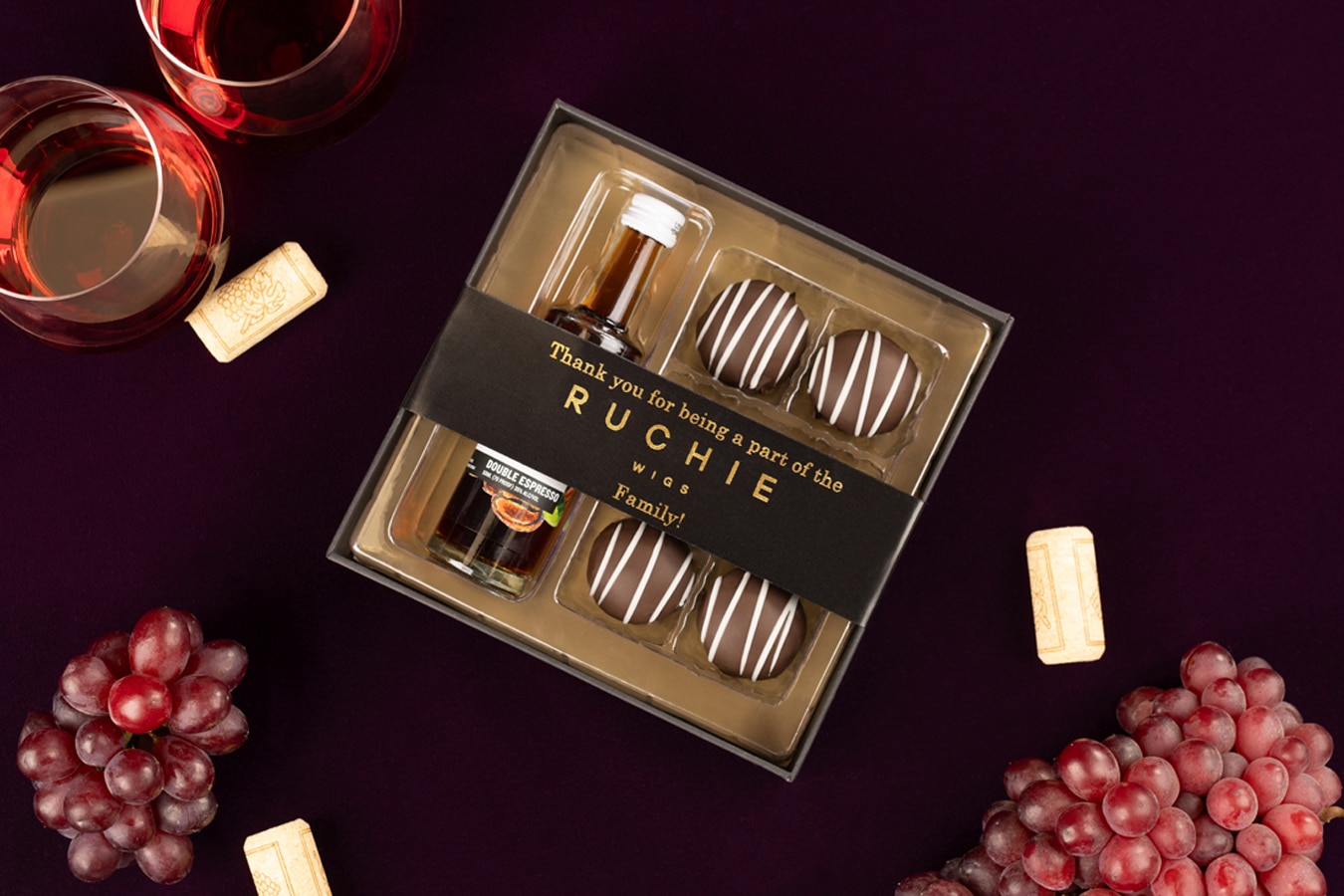 PcPops really has it all: from the two-piece small gift boxes ($4!!), to the larger gift boxes with liquor, all the way up to their beautiful lucite trays, there is something for every single person on your list. Elevate your packages by adding personalized chocolate-covered Oreos, custom ribbon, and even chocolate seals!