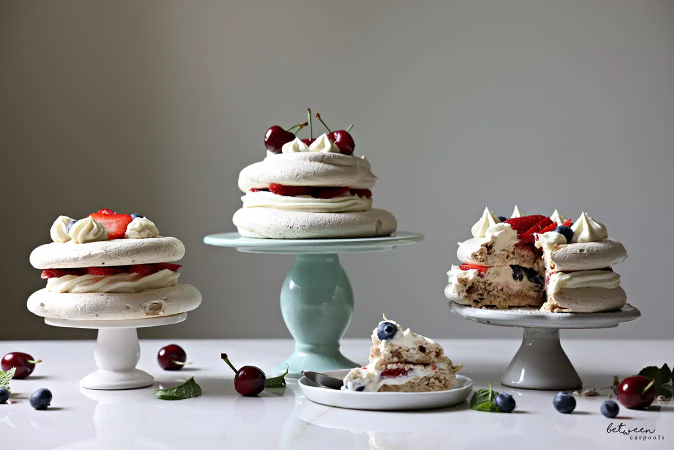 - Once you are ready to serve the meringue cake, remove the meringues from the freezer and garnish with berries.