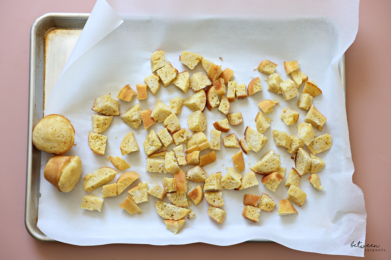 In this dessert, we’re cubing up some corn muffins into croutons. If you want to bake corn muffins, go ahead. But you can totally use store-bought. I happened to have recently baked corn muffins before this photoshoot, but store-bought really works just as well.