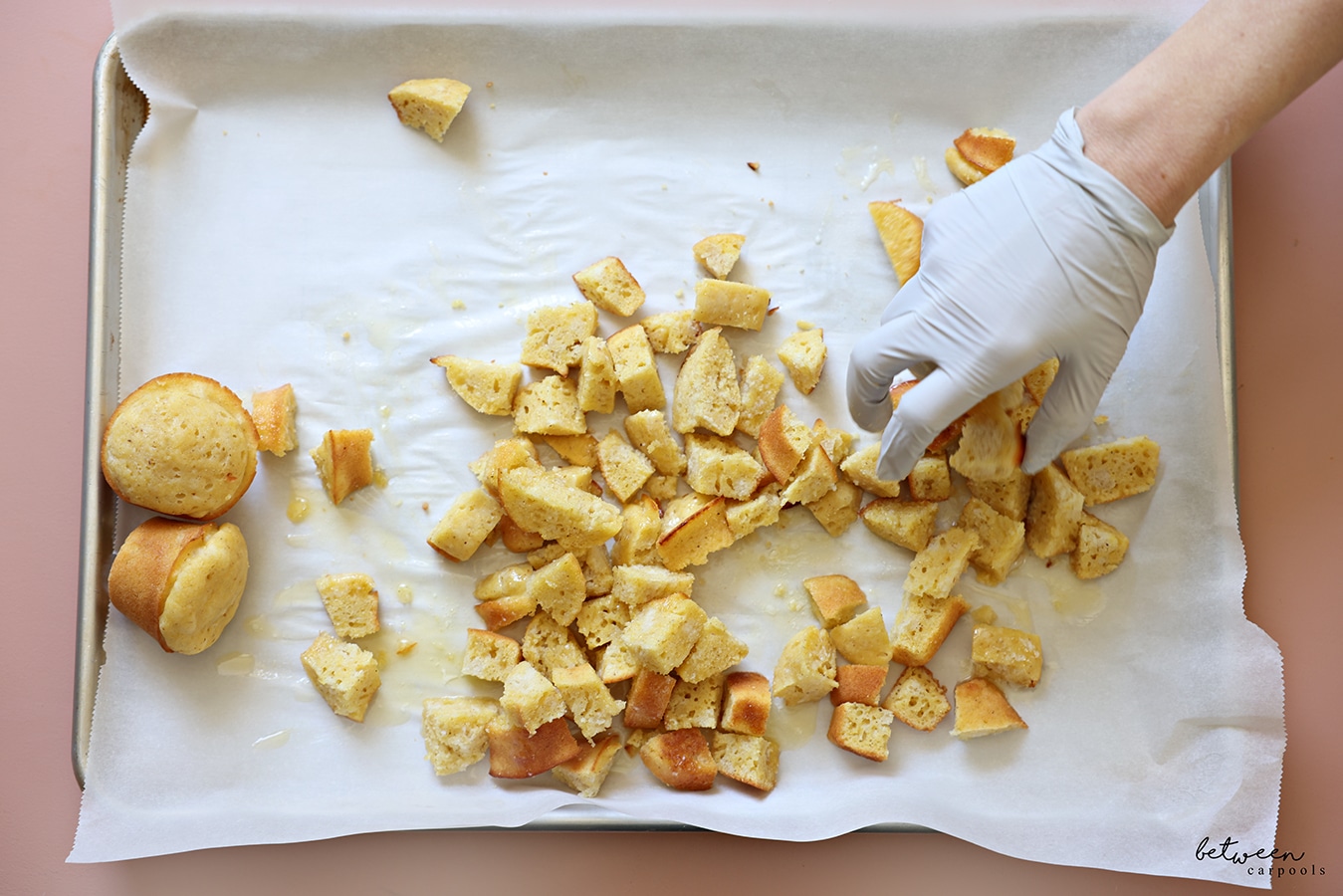 - Preheat oven to 350℉. Spread corn muffin cubes on a parchment-lined baking sheet. Drizzle with melted butter (if you are not using butter, spray with nonstick cooking spray). Bake for 10-12 minutes, until croutons are golden at the edges. Set aside. Although they are great when warm, croutons can be frozen until ready to assemble (bring to room temperature first).