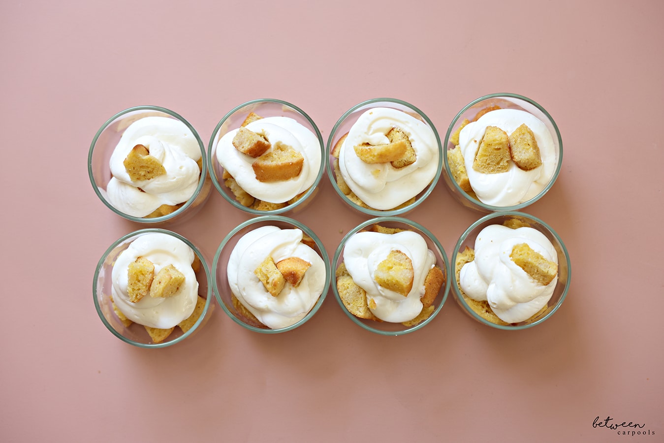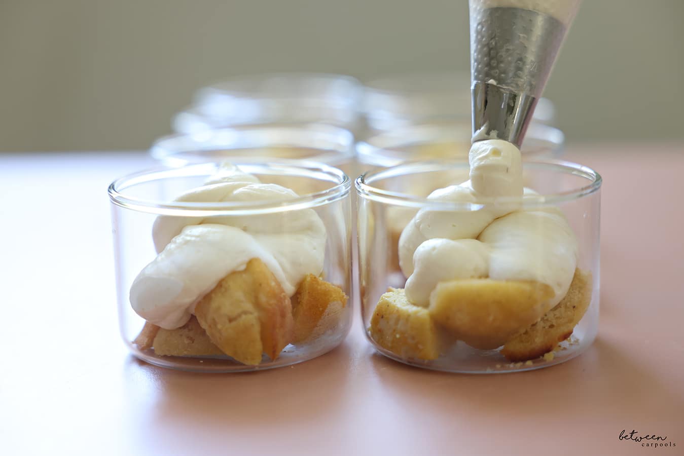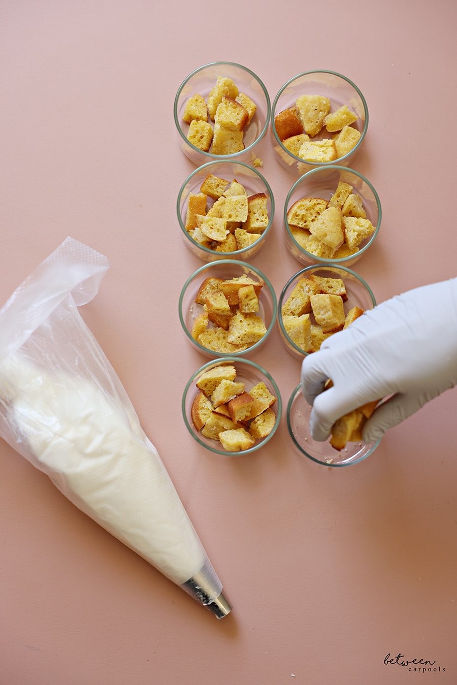 I recommend using this piping bag hack to fill the bag and store the cream so it’s waiting in the fridge for when you’re ready to assemble the final dessert. Add your toasted corn muffin croutons to the ramekins or one larger serving dish.