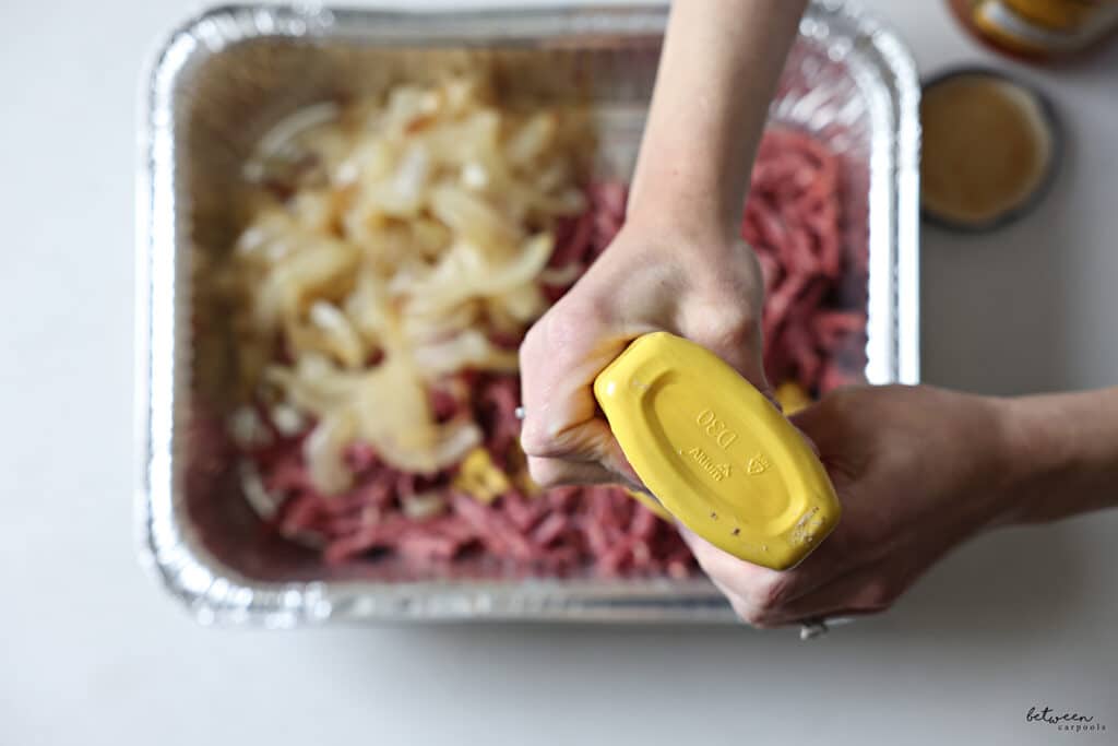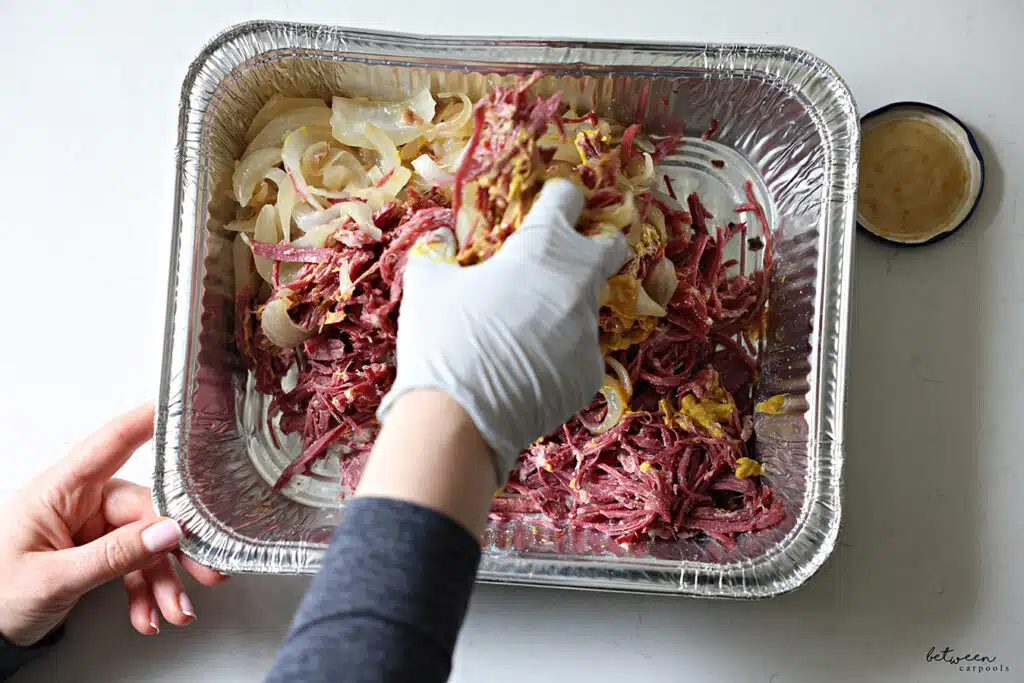 - Open the vacuum sealed bag and drain the liquid from the corned beef. Shred meat. Combine shredded meat, onion, duck sauce, and mustard. The quantity of duck sauce and mustard will be more or less depending on the amount of meat you have. The mixture should look wet but not at all liquidy.