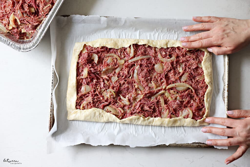 - On a piece of parchment paper, roll out dough in a rectangle that’s almost the size of a baking sheet. Add a layer of meat on top of the dough, leaving a rim around the edges. Fold the edges over the filling. Bake for 20 minutes.