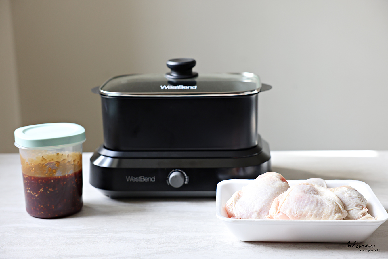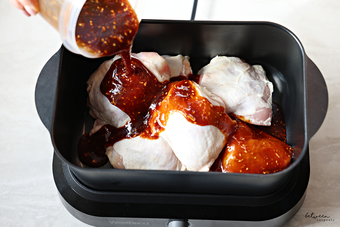 - Add chicken thighs to a Crock-Pot. Add sauce ingredients. Cook on low for at least 4 or up to 7 hours. You can also cook on a higher setting for 4 hours to attain that crispiness you see pictured.