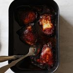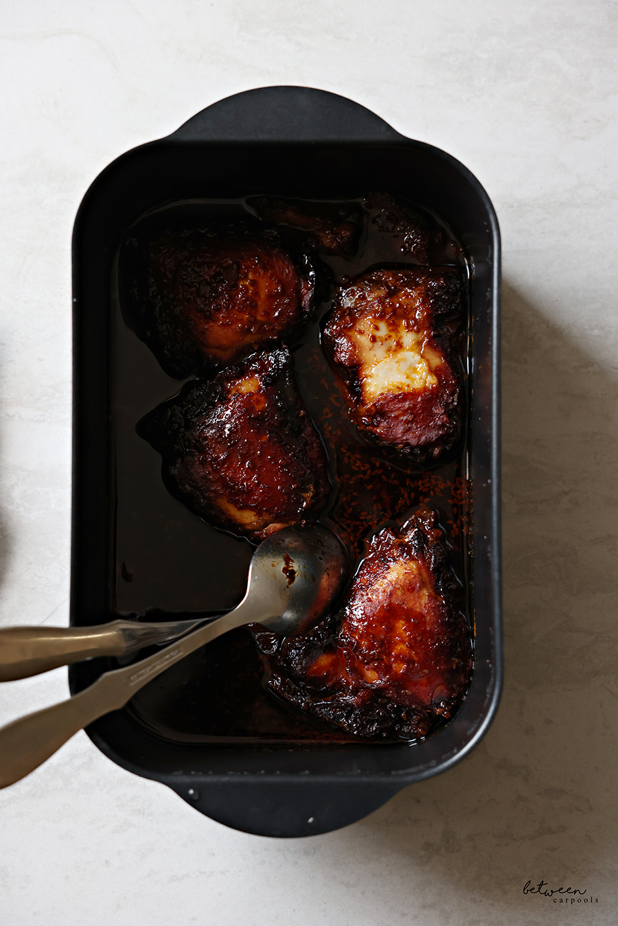 I just did it in the oven at 350 for 1 1/2-2 hours, uncovered, and every now and then I basted the chicken again and got the yummy stickiness…