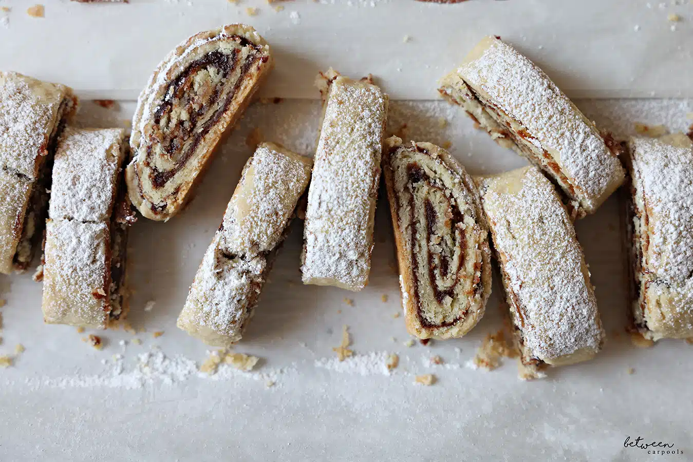 Once you take them out of the oven, slice through each cut to make separate cookies. Once you’ve done that, they should be cool enough and ready to be sprinkled with a generous amount of confectioners’ sugar.