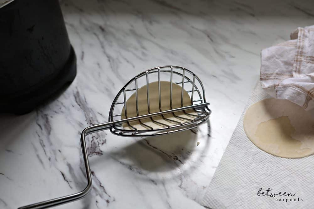 You’ll need: A taco shell maker/taco press, which looks like tongs.