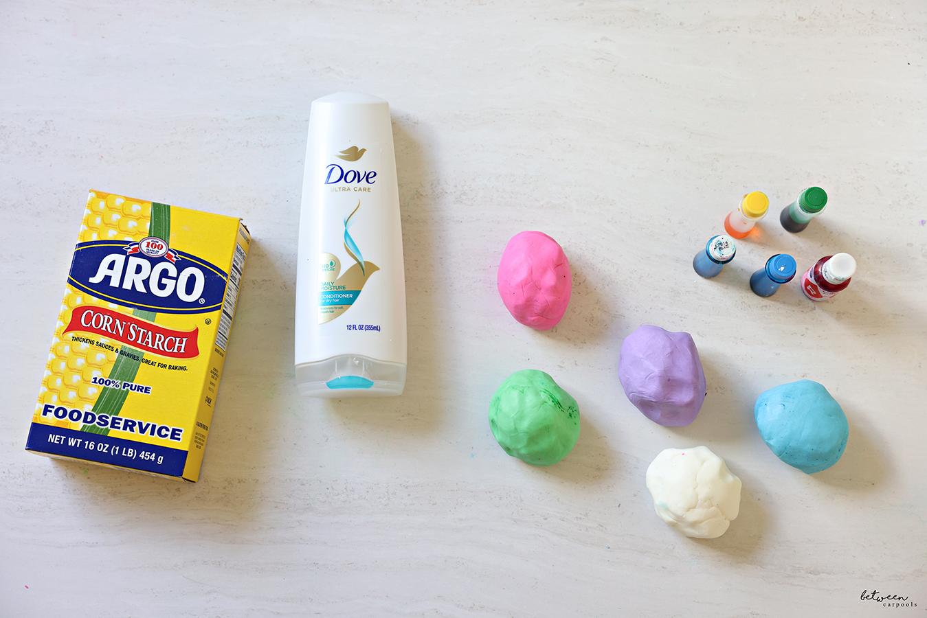 - Mix together conditioner and cornstarch until playdough achieves the consistency you like. Add desired food coloring.
