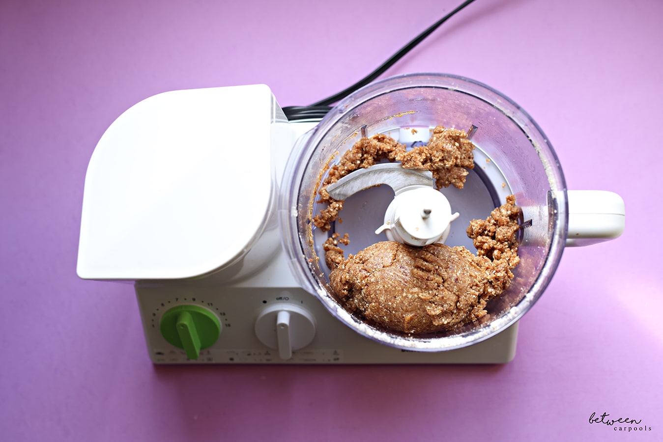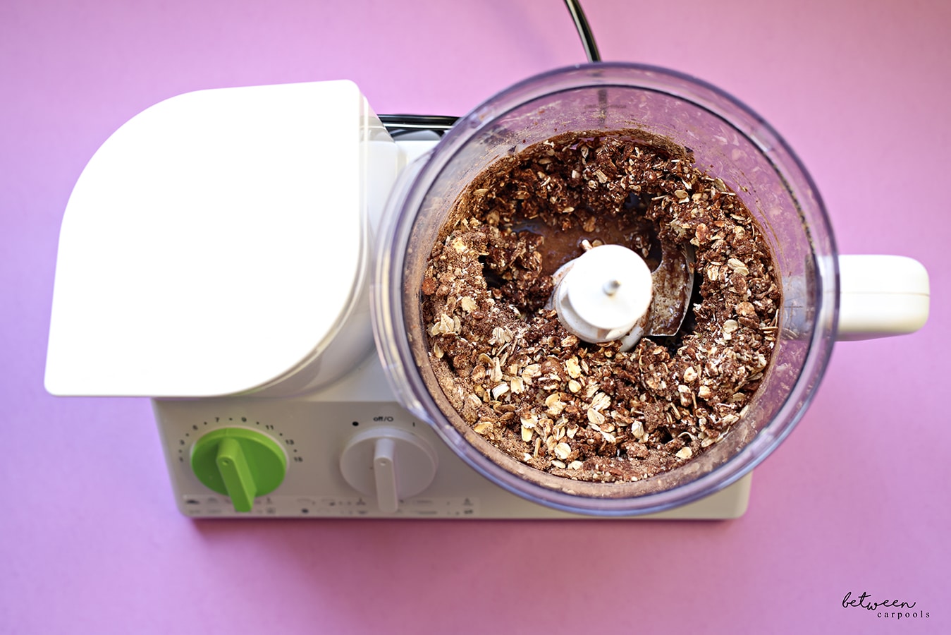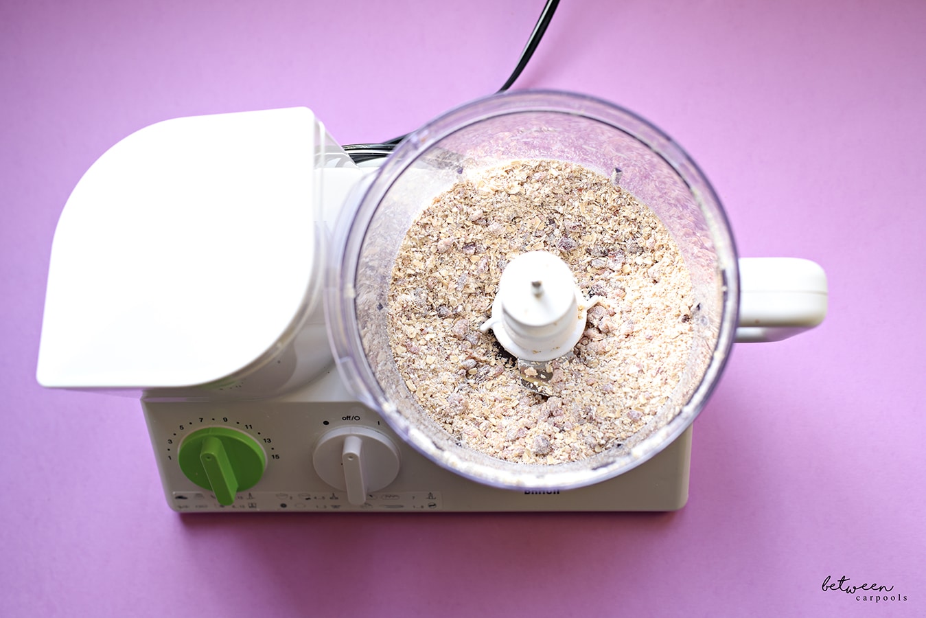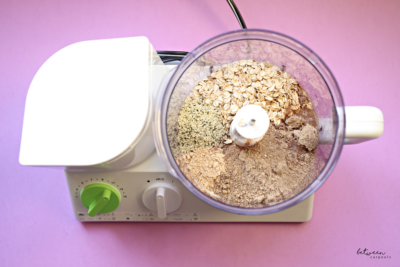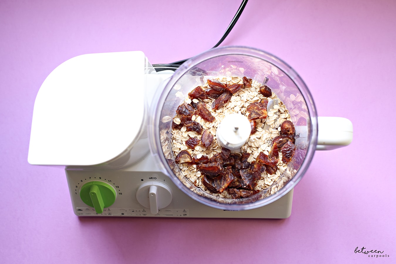 - First, combine oats and dates in a food processor. Pulse to combine. The oats and dates have to be fully blended before adding the rest of the ingredients.