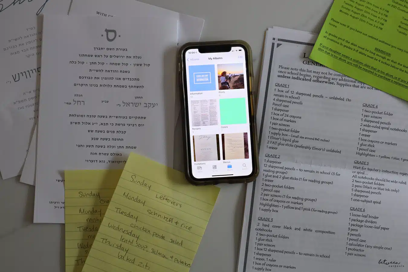 Whenever I get correspondence from a school or camp that I’ll need to refer to in the future, I snap a picture and add to my school/camp info album. These include school calendars, bus passes, mishloach manos teacher lists, school supplies lists, etc. Instead of papers floating around the house, I can throw them out and still have access to the information at a moment’s notice.
