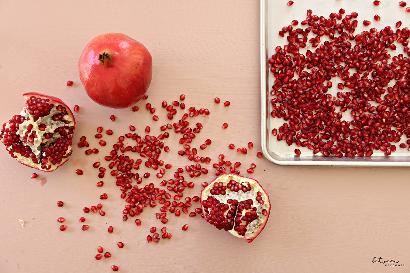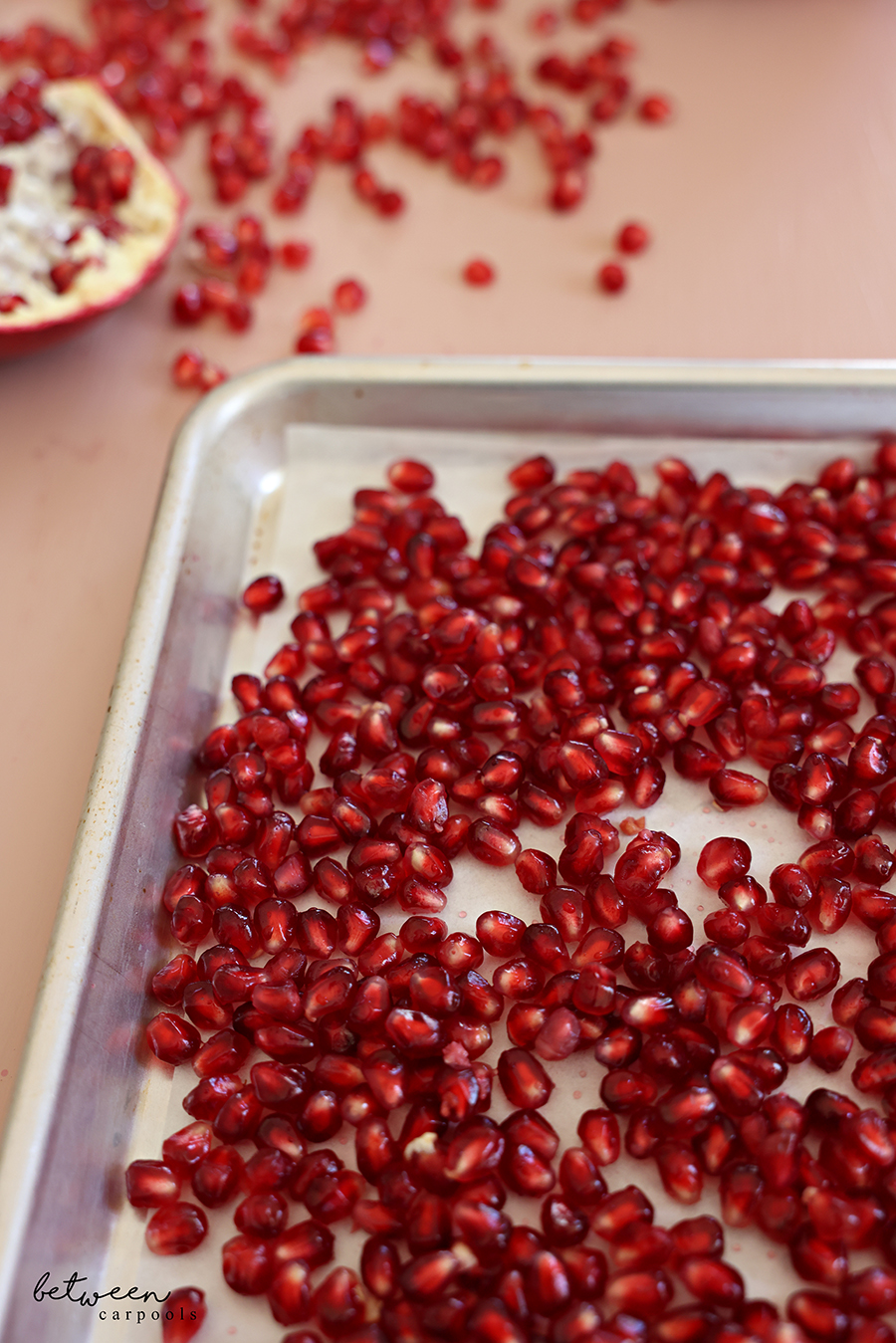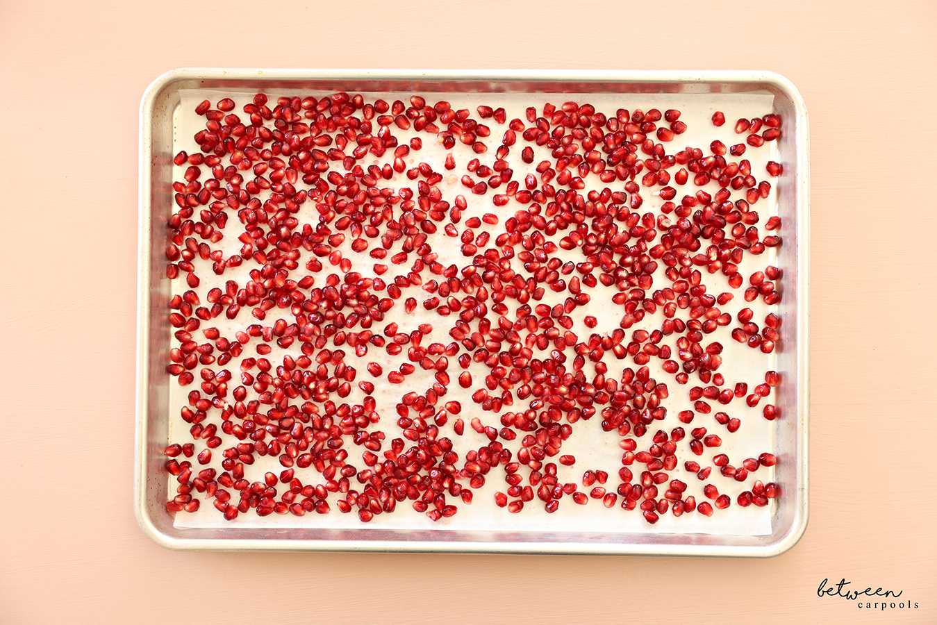 Just spread your pomegranate arils (or pomegranate seeds, if you prefer) on a parchment lined sheet pan