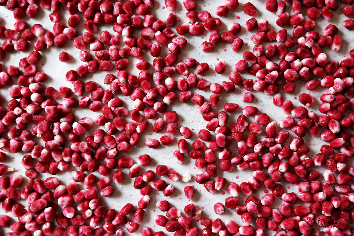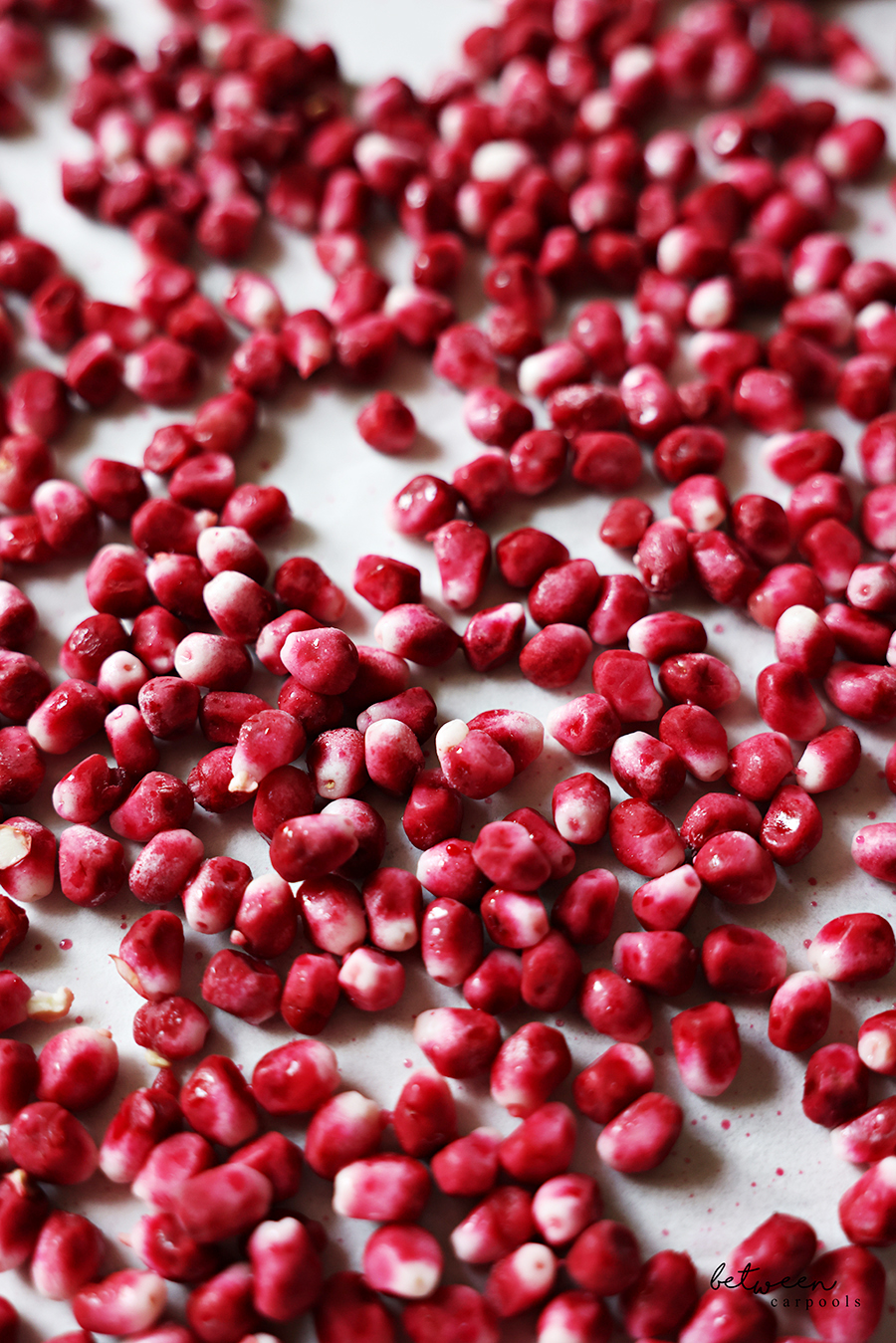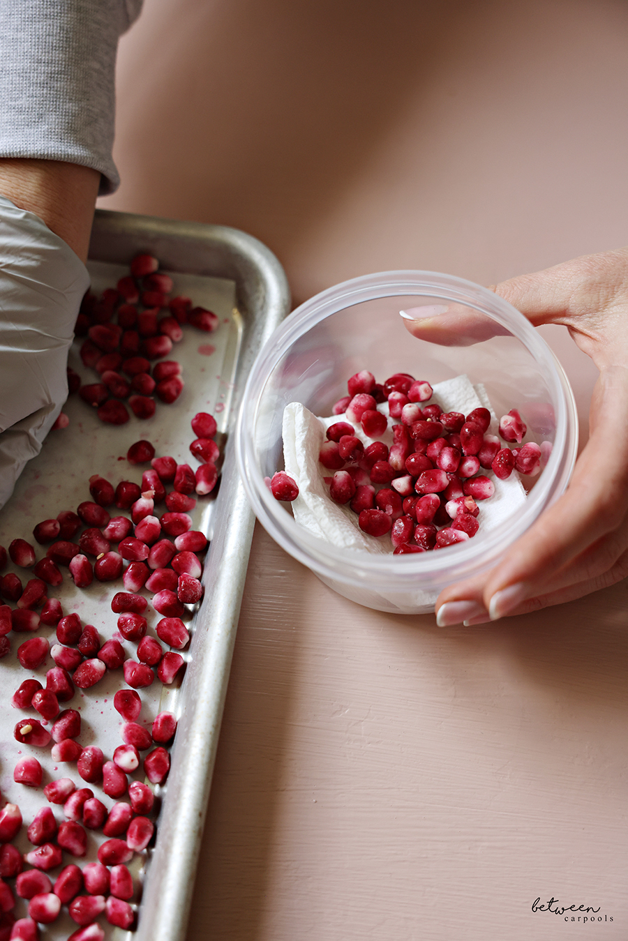 Just spread your pomegranate arils (or pomegranate seeds, if you prefer) on a parchment lined sheet pan