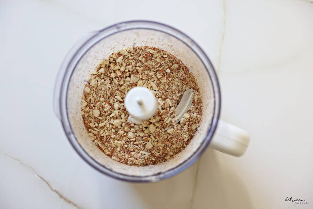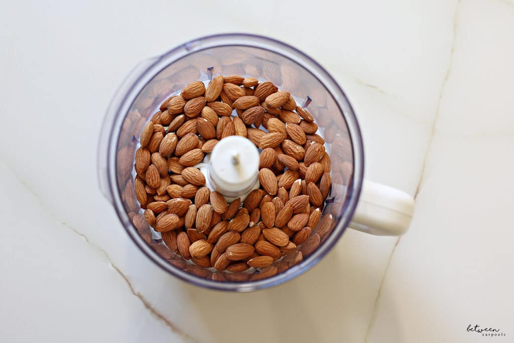 Start with 8 ounces of raw, unsalted almonds. Add them to a food processor fitted with the S blade.