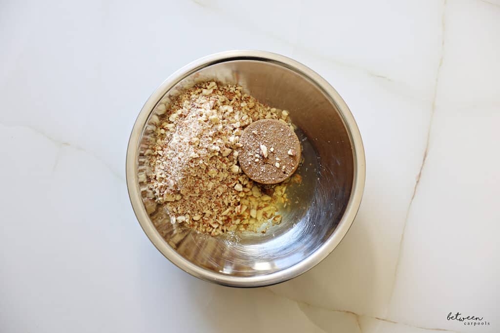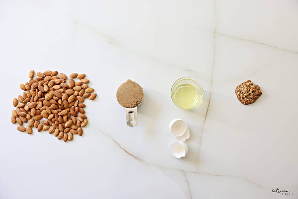 - In a food processor, blend almonds until they are small pieces (not too fine). Place in a bowl. Add egg whites and brown sugar. Refrigerate batter for 30 minutes.
