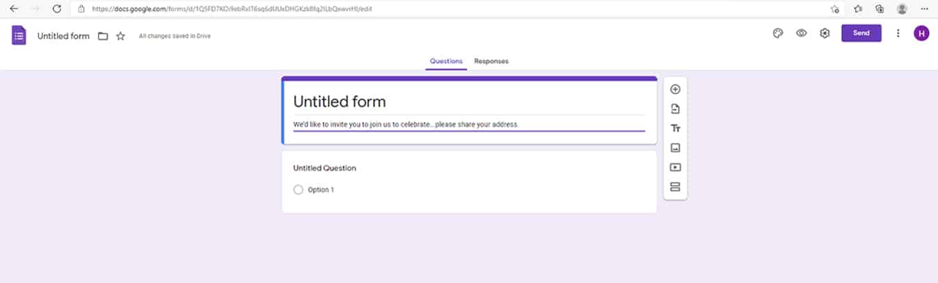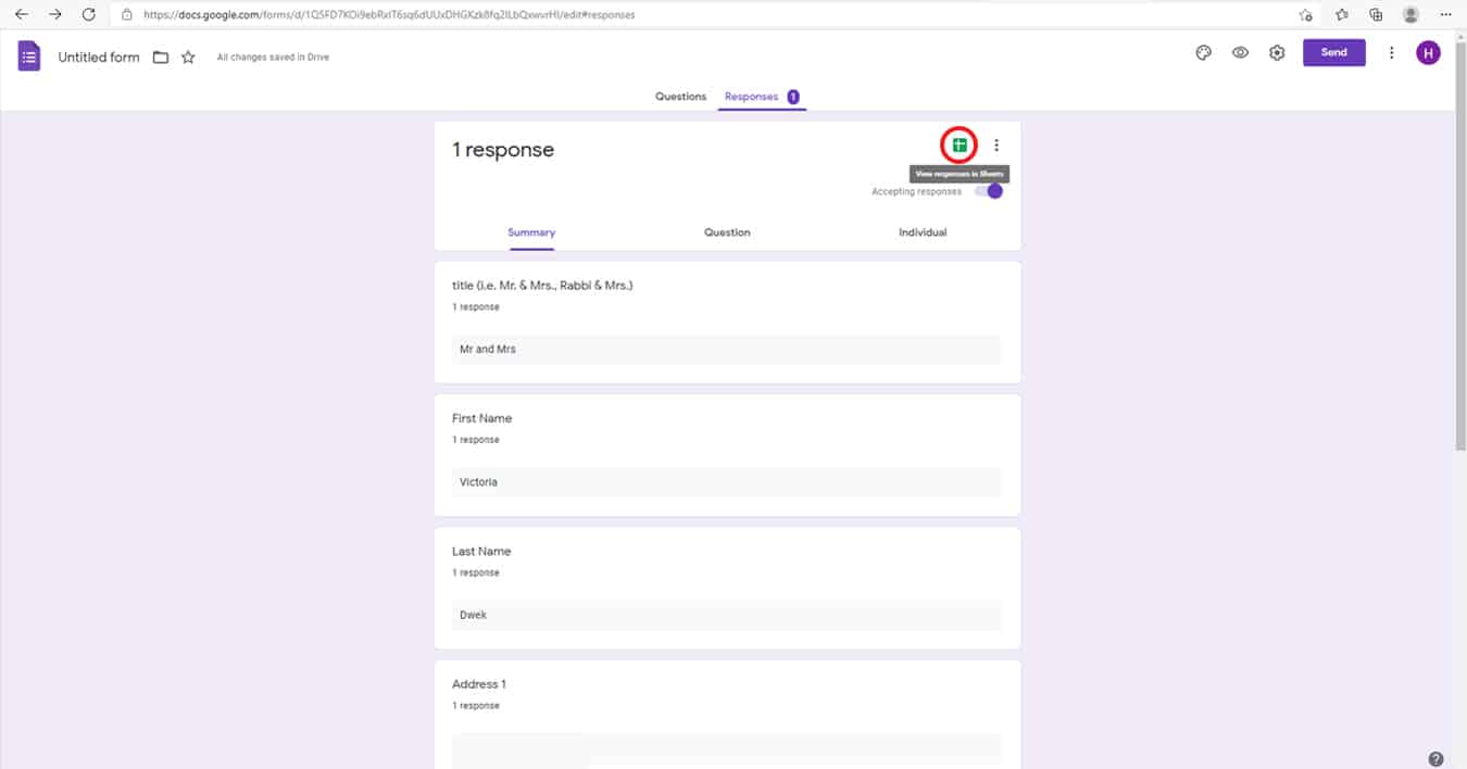 - To view your list, click on “responses” on the form. There’s a little spreadsheet icon on top right corner. Hover over it and you’ll see the words ‘View responses in Sheet.” Click that and you’ll be able to see all guests and addresses in the spreadsheet format. You can add any address you want to this list (i.e. the people who you are not sending the link). As your guests insert their addresses, the list will automatically add them in a push the entries you manually inserted further down on the list.