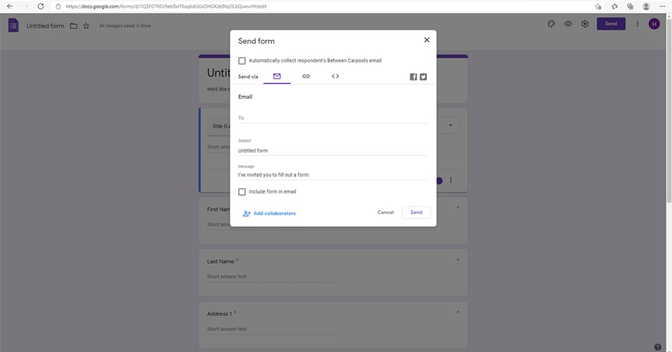 - Click “Send” in the top right corner. Then, you can choose to email links to this form. Or, you can simply copy and paste the link into a text message. When your contacts fill out the form, it will automatically be added to your list.