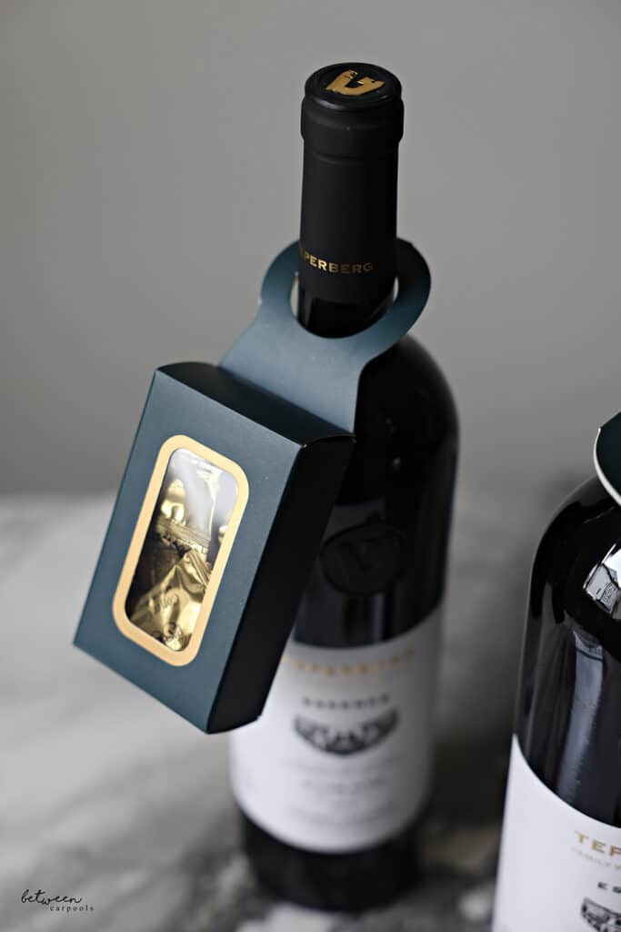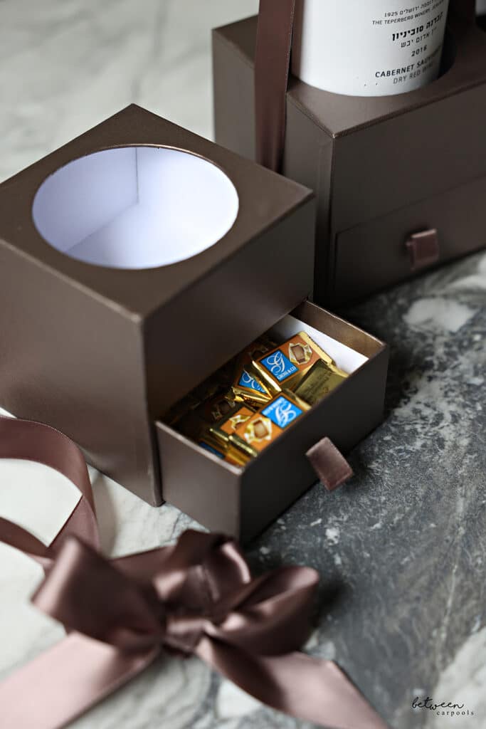 If you want to include something more significant with your wine, we also really like this wine bottle gift box with a pullout drawer. It comes in a few colors and it’s also so effortless.