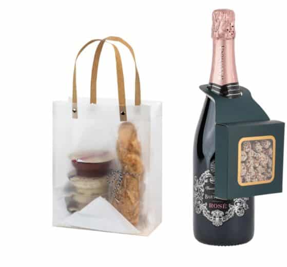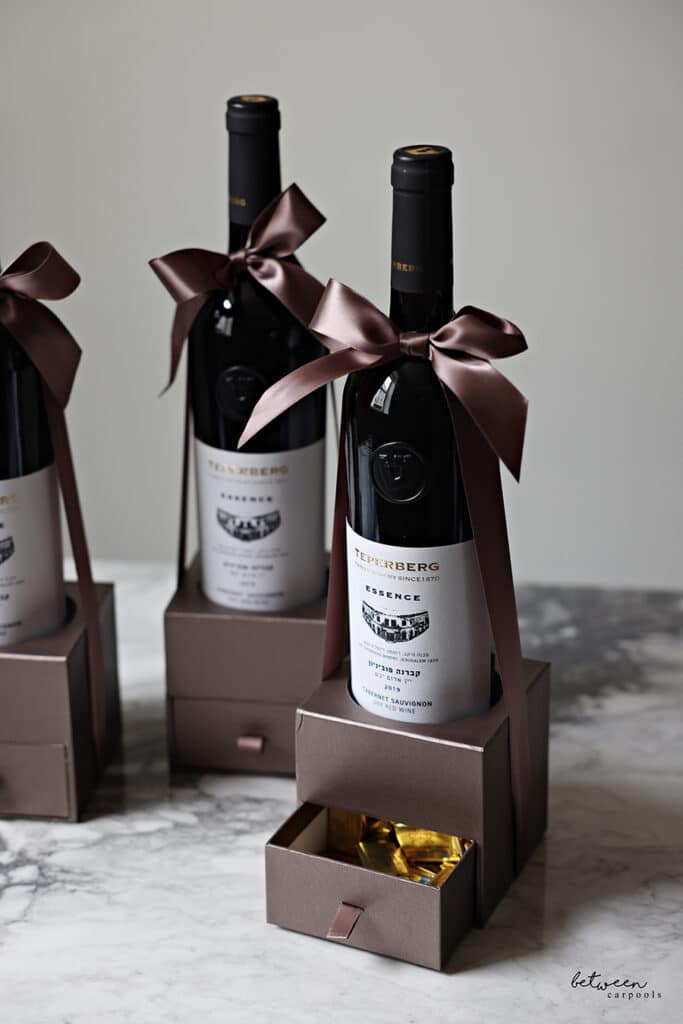Our first top pick are these perfect little gift box hanger. Just fill and hang them on your bottle of wine for the perfect, classy mishloach manos.