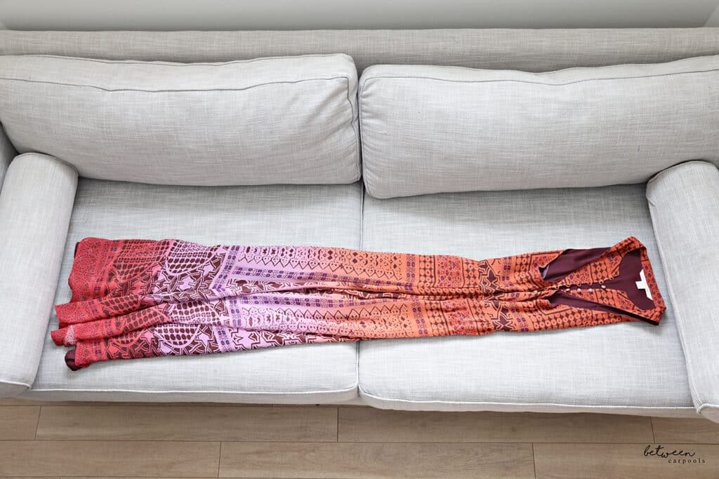 The first is simplest. Instead of hanging the dress the usual way, fold the dress over the bar of the hanger. Easy. Also, great for knits which shouldn’t be stretched out on a hanger. This method might not work well for slippery fabrics and it can also be hard to see the dress when it’s hanging between other items.