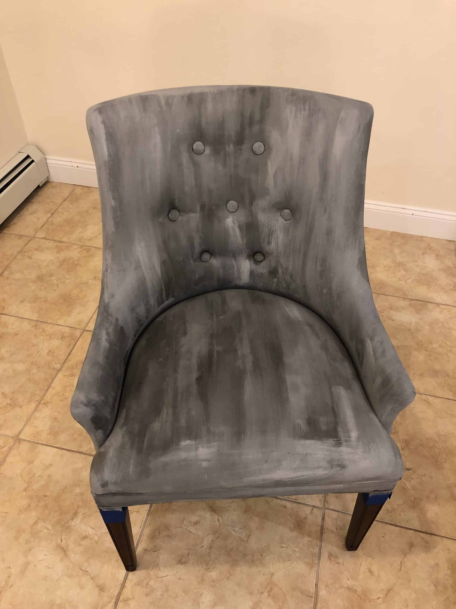 For years I held on to two upholstered chairs that had seen better days. The shape was great and the seat was comfortable but, unfortunately, too many sticky hands had touched each of them and they were impossible to clean. I relegated them to the basement with plans of reupholstering them. When the reupholster’s quote came in at approximately $500 per chair, I realized it made no sense to pay more to fix them than the initial purchase price. Still, I held on to the chairs hoping to do something with them. Fast forward to this past summer. On a trip to Target, I spied chalk paint on sale (Devine Color by Valspar Chalky Finish Paint). I had read some articles about painting upholstery with chalk paint and figured it wouldn’t hurt to try it out. Worst case scenario it wouldn’t work and I would throw the chairs out.