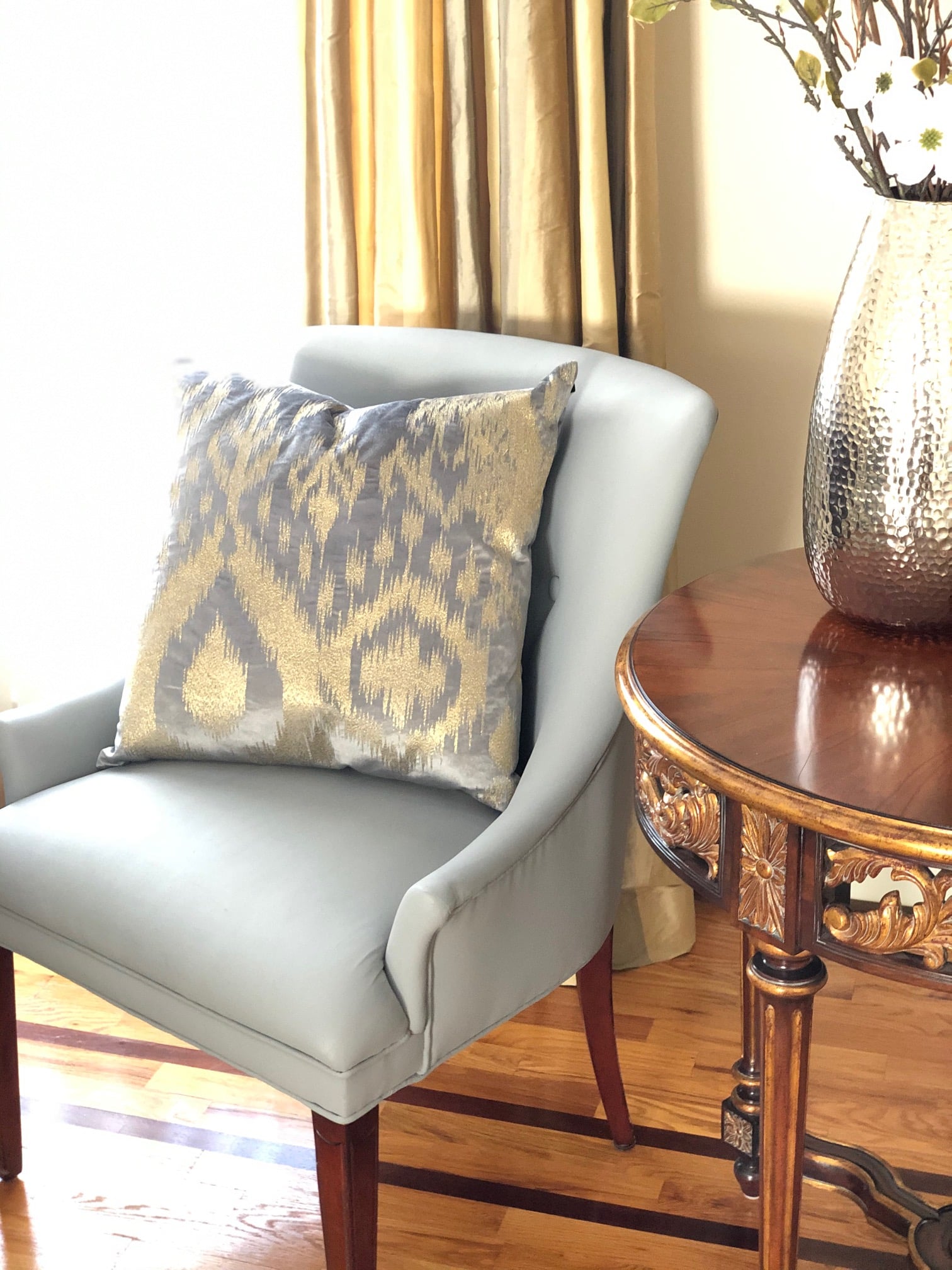 Through trial and error, I ended up with a magnificent end product. Each time I see these chairs in my living room I can’t believe that they are the same chairs. Six months after painting them I can report that they are holding up unbelievably well. They are comfortable to sit on, even though the fabric has a stiffer feel to it, and are as beautiful to look at as the day they were done!