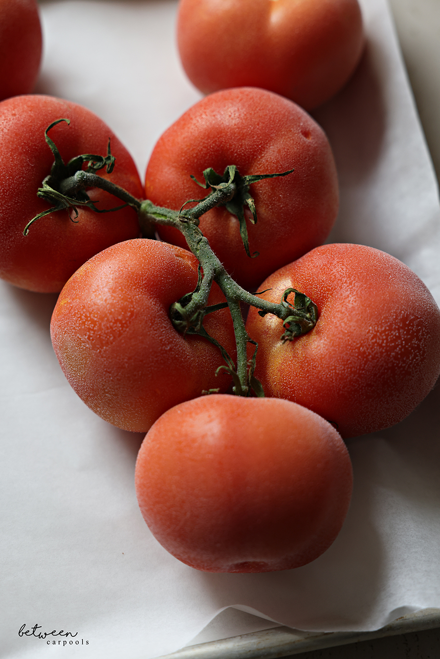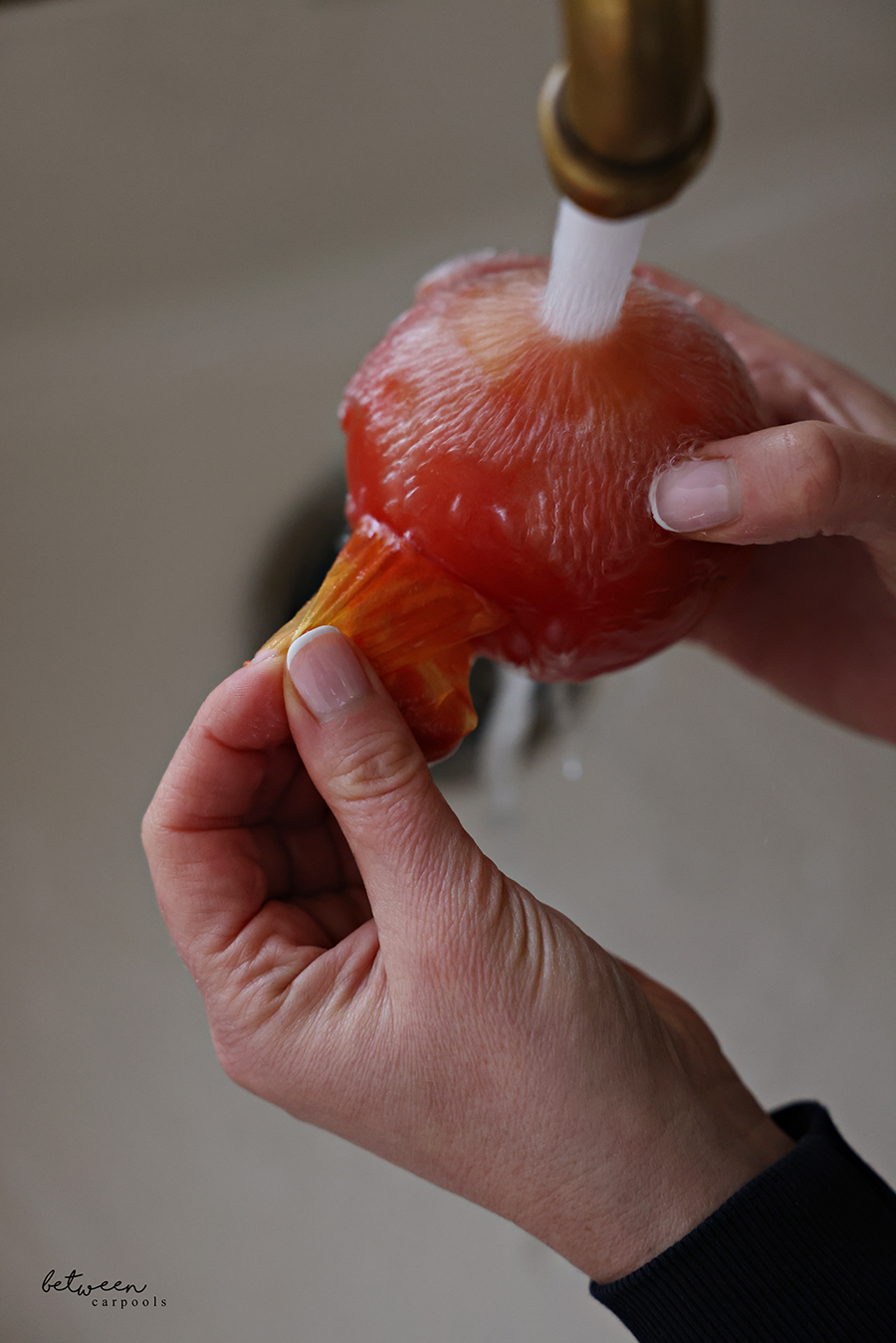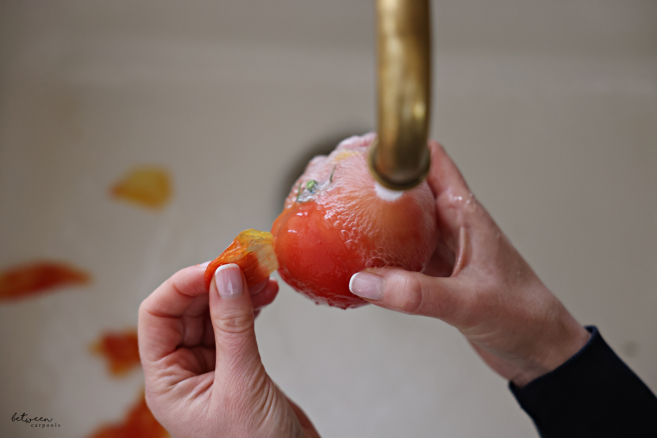 Once frozen solid, simply run the tomato straight from the freezer under warm running water and watch the skin magically lift off. No need to cut or score.