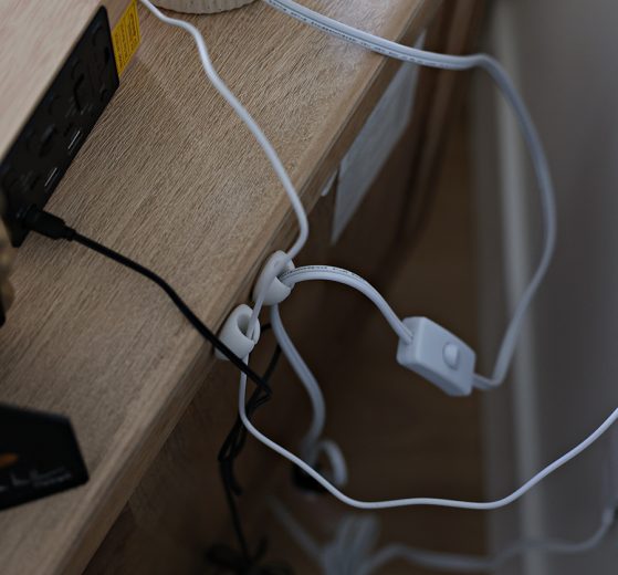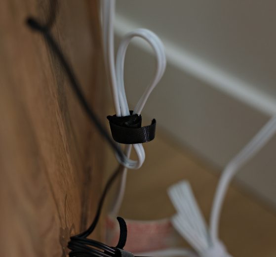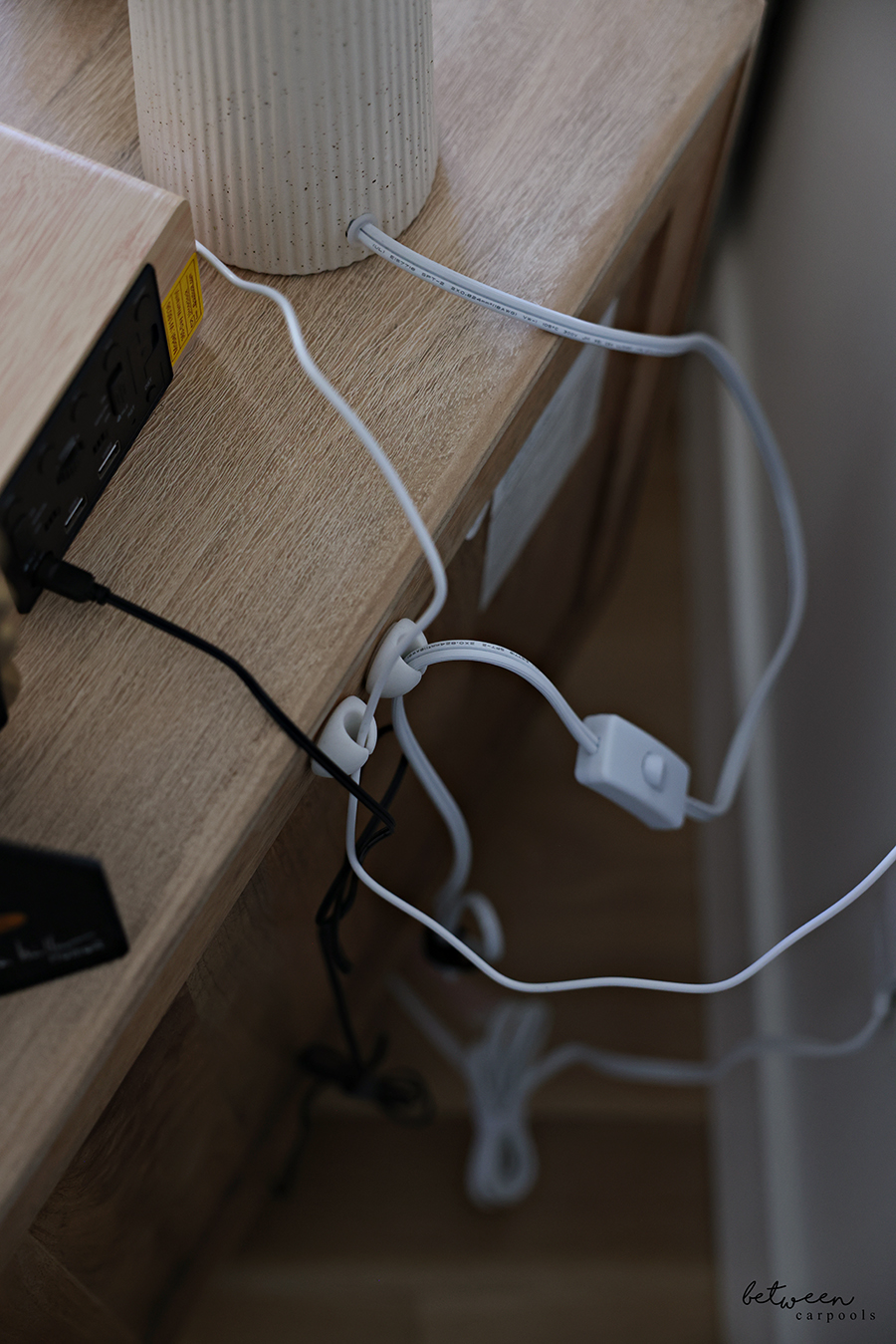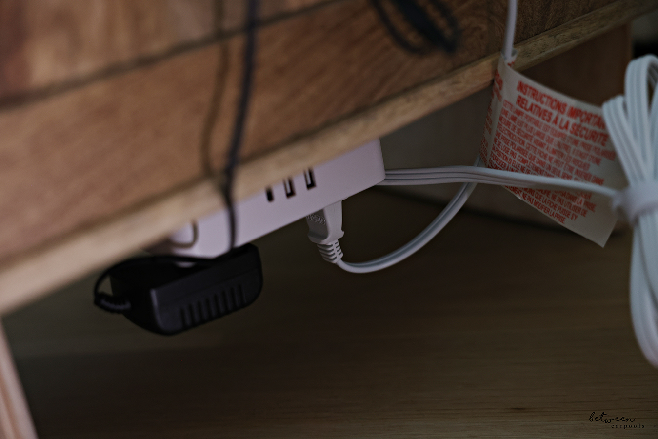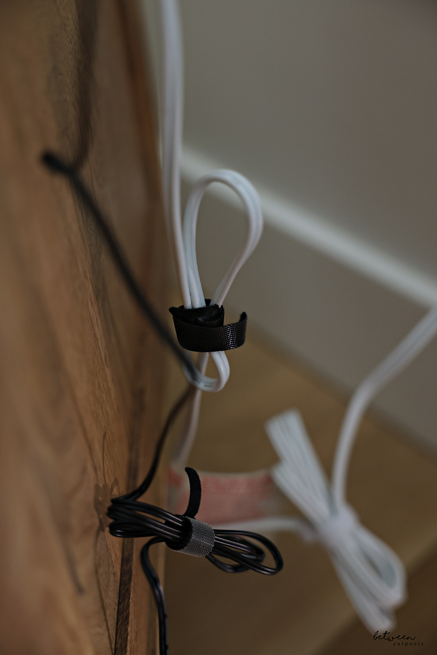 That’s why you need these little wire holders. Stick them on to the back of the furniture strategically and they’ll hold the wire in place. If you’re using them for phone or 24six chargers like we are, you can just push the wire down to the holder when not in use and easily pull it out when you want to access it. And any wire that’s too long can be folded up and wrapped with a velcro tie to keep it neat. Then you won’t see anything under or on the sides of the furniture.