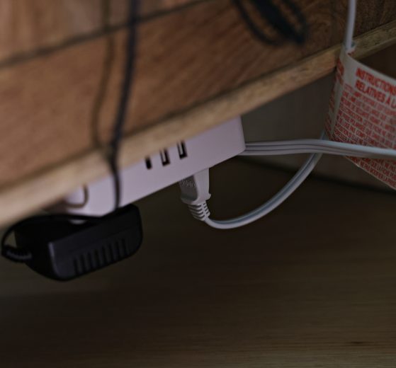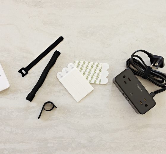 That’s when you want to get this multi-outlet power strip that also has a flat plug. You then have several feet of wire to pull the strip wherever you can use it discreetly. For a nightstand, we just used some velcro strips to attach the power strip to the underside of the nightstand. You can do the same under a desk or a bed. The cord comes in several lengths, so you can choose the one that gives you the length you need. And if it’s too long, just fold it up and secure it with the included velcro tie.