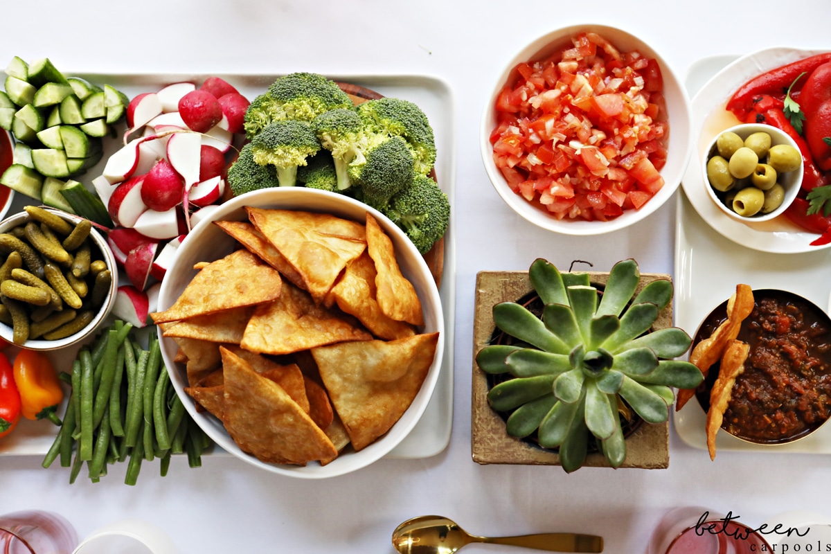 Fresh guacamole (with lime, salt and that is all) is always a crowd-pleaser with chips. So is this simple tomato and onion salad. And veggies. Did we mention veggies? Lots and lots of cut-up veggies. If you are pressed for time, consider buying the ready cut ones that so many groceries nowadays offer. When laying out the veggies, make sure to use the colors and textures to your advantage. Don’t put two groups of similar colors near each other—unless they have a contrasting texture. Keep things interesting!