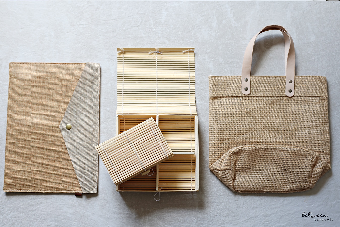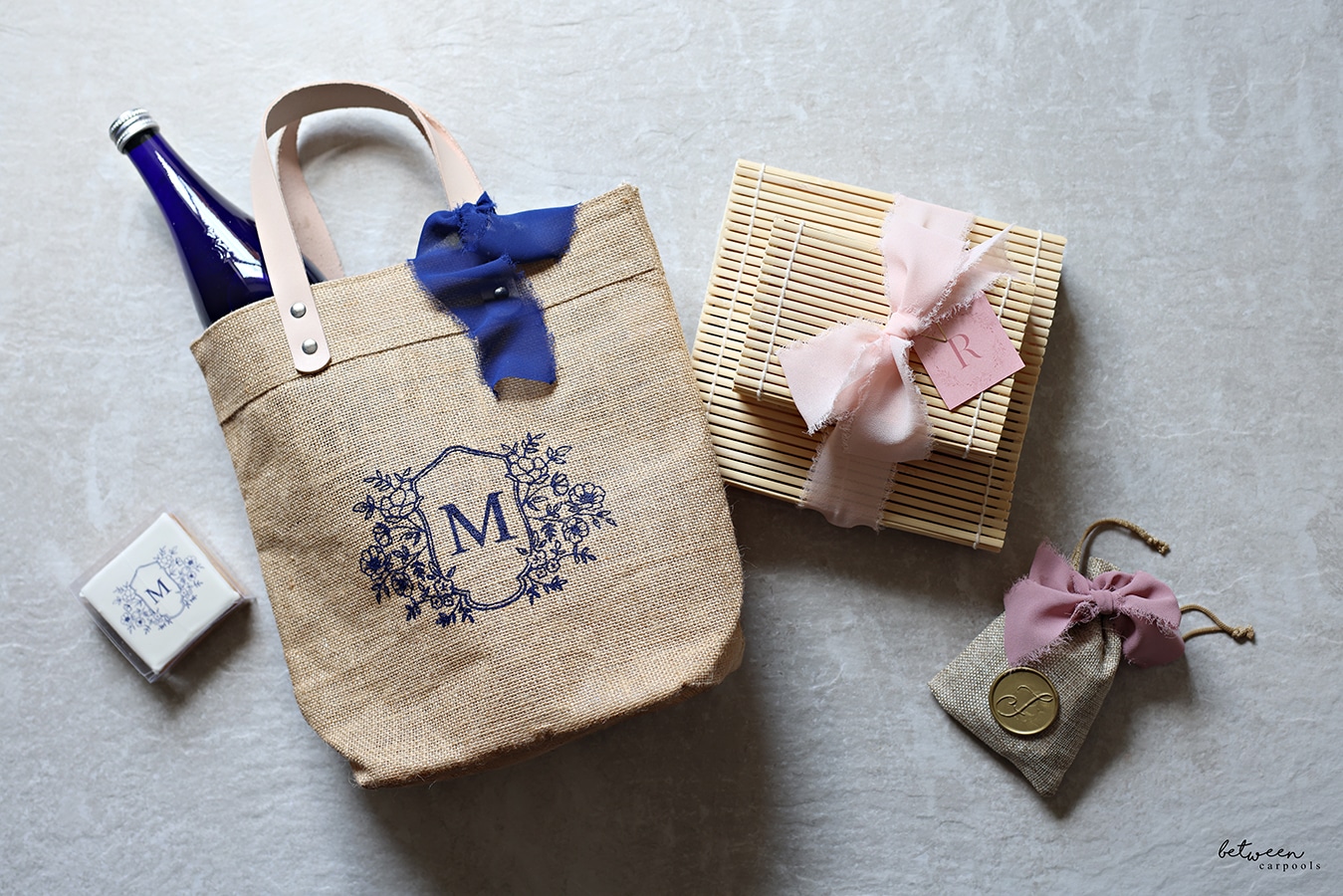 Water is something you don’t want your guest to be without! To begin, make sure the bottle fits into the bag you bought. You can include one large bottle of water or two smaller bottles. Water is a great way to bring in your accent color: think green Perrier, blue Saratoga, grey Voss, orange Aqua Panna… Be sure to include straws or cups.